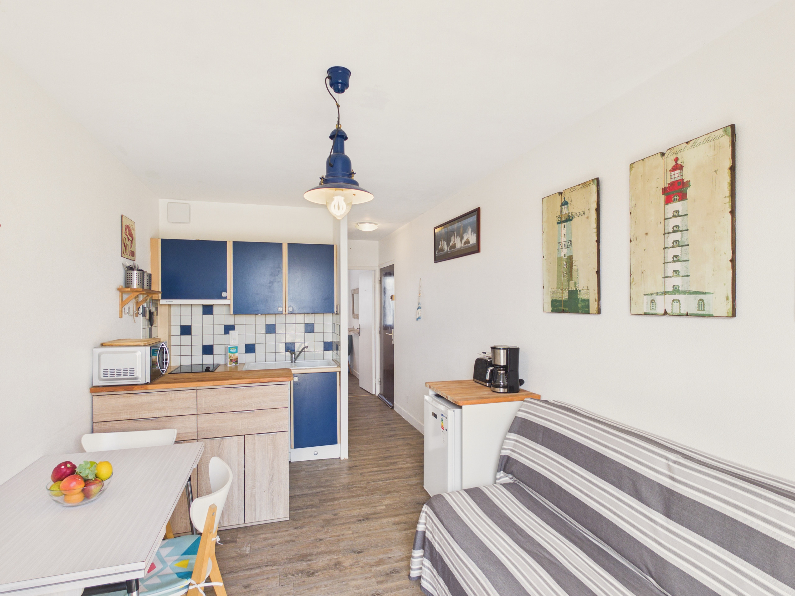Die offene Küche ist vollständig ausgestattet (Kühlschrank, Ofen, Mikrowelle und Induktionskochfeld) und bietet Ihnen alles Notwendige zur Zubereitung Ihrer Mahlzeiten. Zum Frühstück stehen Ihnen auch ein Wasserkocher, ein Toaster und eine Filterkaffeemaschine zur Verfügung.