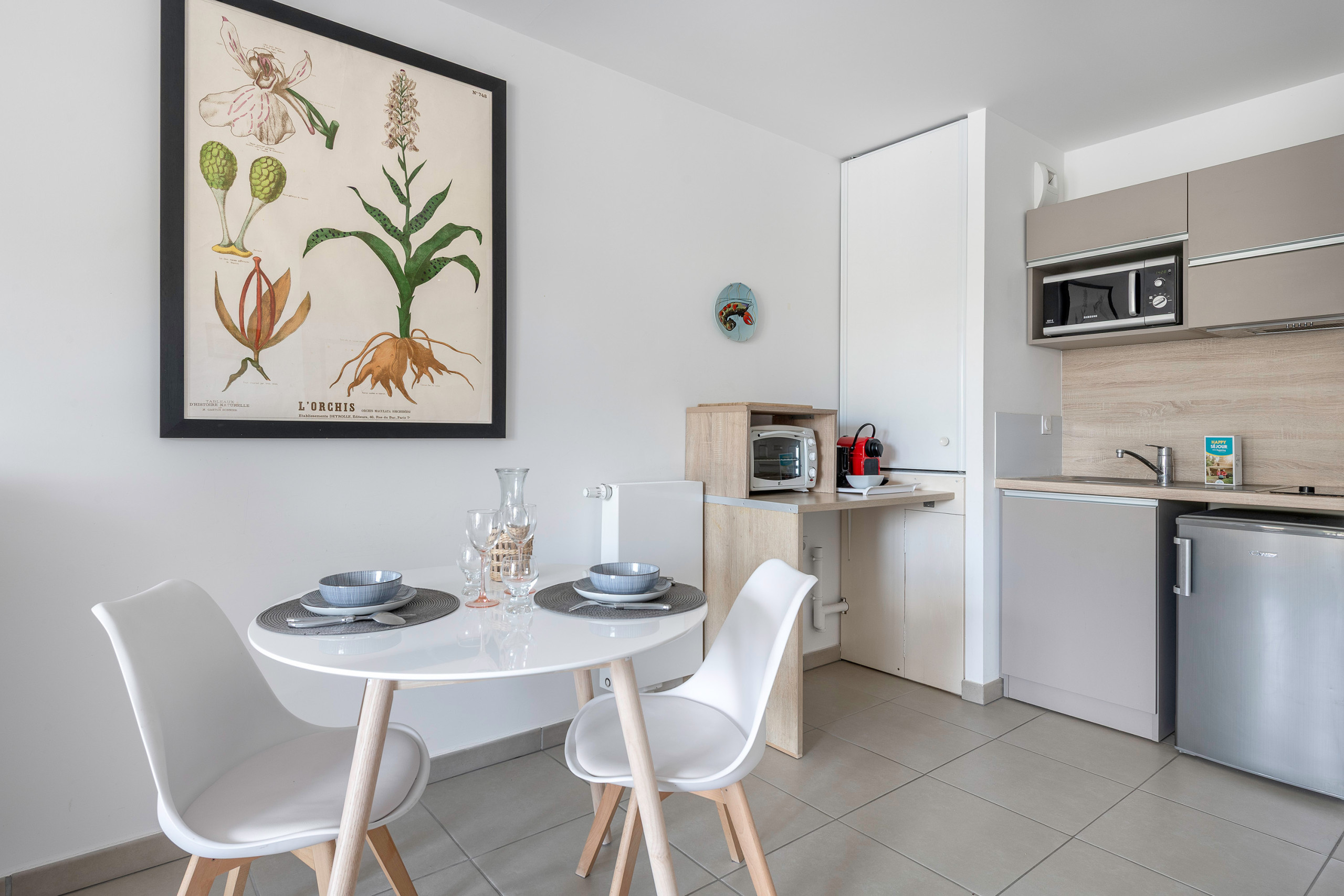 Die Unterkunft verfügt über ein TV-Wohnzimmer, das Zugang zu einer kleinen Terrasse bietet, sowie eine ausgestattete und eingerichtete Küche; Induktionsherde, Mikrowelle, Minibackofen, Nespresso-Kapselmaschine, Kühl-Gefrier-Kombination, Toaster, Wasserkocher, Küchenutensilien und -zubehör. Ein Haartrockner, eine Waschmaschine sowie Außenmöbel (Sessel, Tisch und Sonnenschirm) werden ebenfalls zur Verfügung gestellt. Sie verfügen über einen privaten und überdachten Parkplatz innerhalb der Residenz.