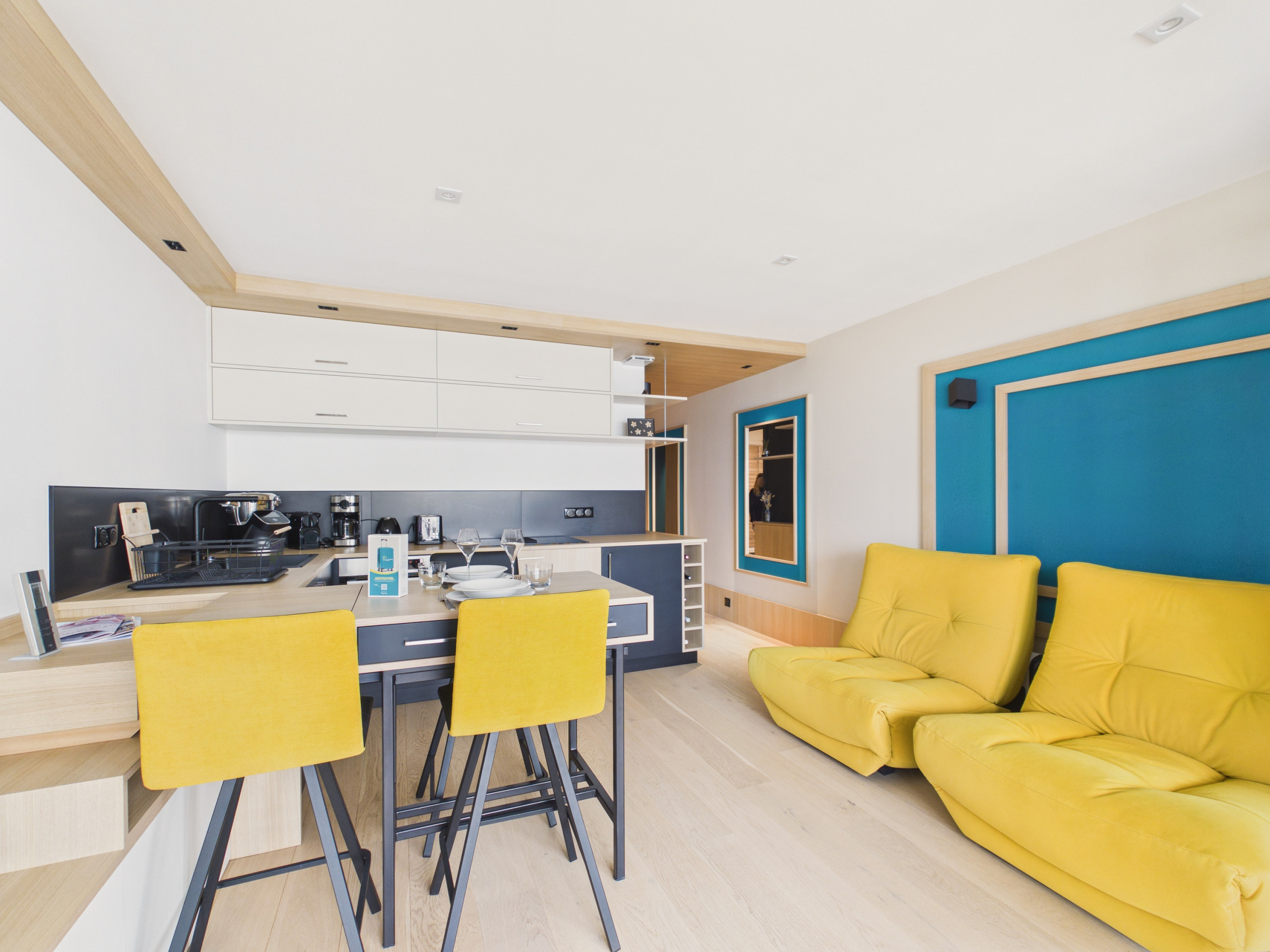 Im Inneren der Wohnung werden Sie bei Ihrer Ankunft einen einladenden und lichtdurchfluteten Wohnbereich entdecken. Der Loungebereich besteht aus zwei bequemen Sofas, einem Sessel und einem Fernseher, die zum Entspannen nach einem Tag am Meer einladen. In der Nähe befindet sich der Essbereich mit einem Tisch, der bis zu 3 Personen Platz bietet, um gemeinsam Mahlzeiten zu teilen. Die offene, moderne und funktionale Küche ist komplett ausgestattet: Induktionsherde, Kühlschrank, Gefrierschrank, Backofen, Mikrowelle, Filterkaffeemaschine und Nespresso, Toaster, Wasserkocher und alles Nötige, um wie zu Hause zu kochen.