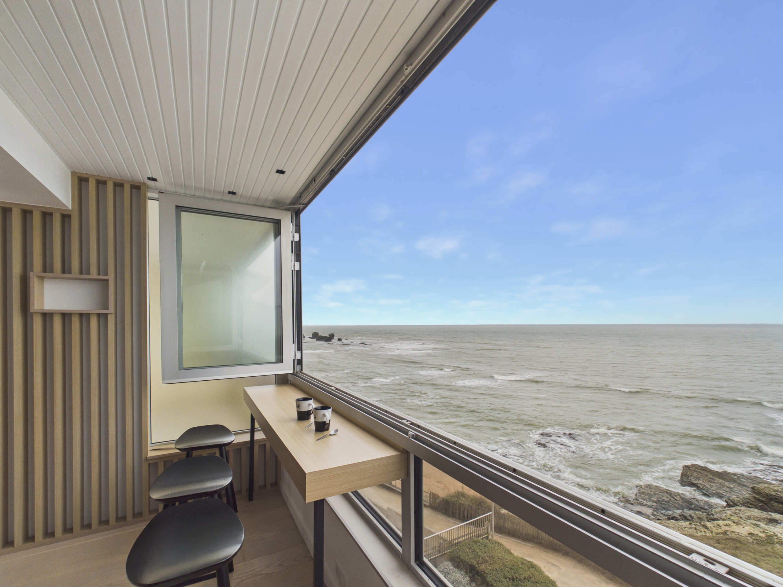Der wesentliche Vorteil dieser Wohnung liegt in der herrlichen Loggia, die in jeder Jahreszeit angenehm ist, mit ihrem wunderschönen Blick auf den Ozean. Direkt vom Wohnzimmer aus zugänglich durch eine große Glasfront, die sich vollständig öffnet, um den Wohnbereich zu vergrößern, ist dieser Raum mit einem kleinen Stehtisch und Hockern ausgestattet, perfekt, um morgens einen Kaffee zu genießen oder die Sonnenuntergänge am Ende des Tages zu bewundern.