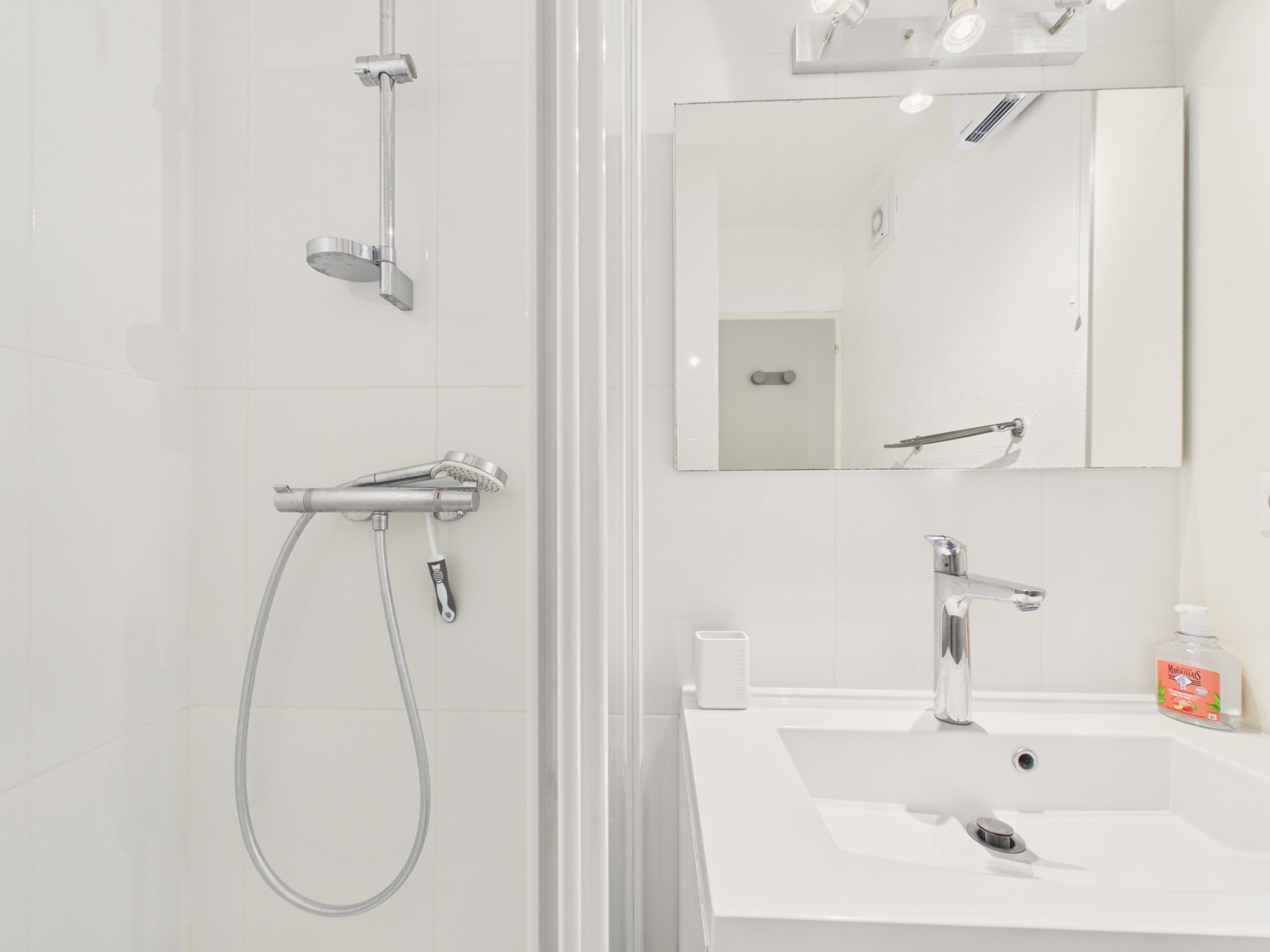 Das Badezimmer verfügt über eine bodengleiche Dusche, und die Toiletten sind zur Erhöhung des Komforts getrennt.