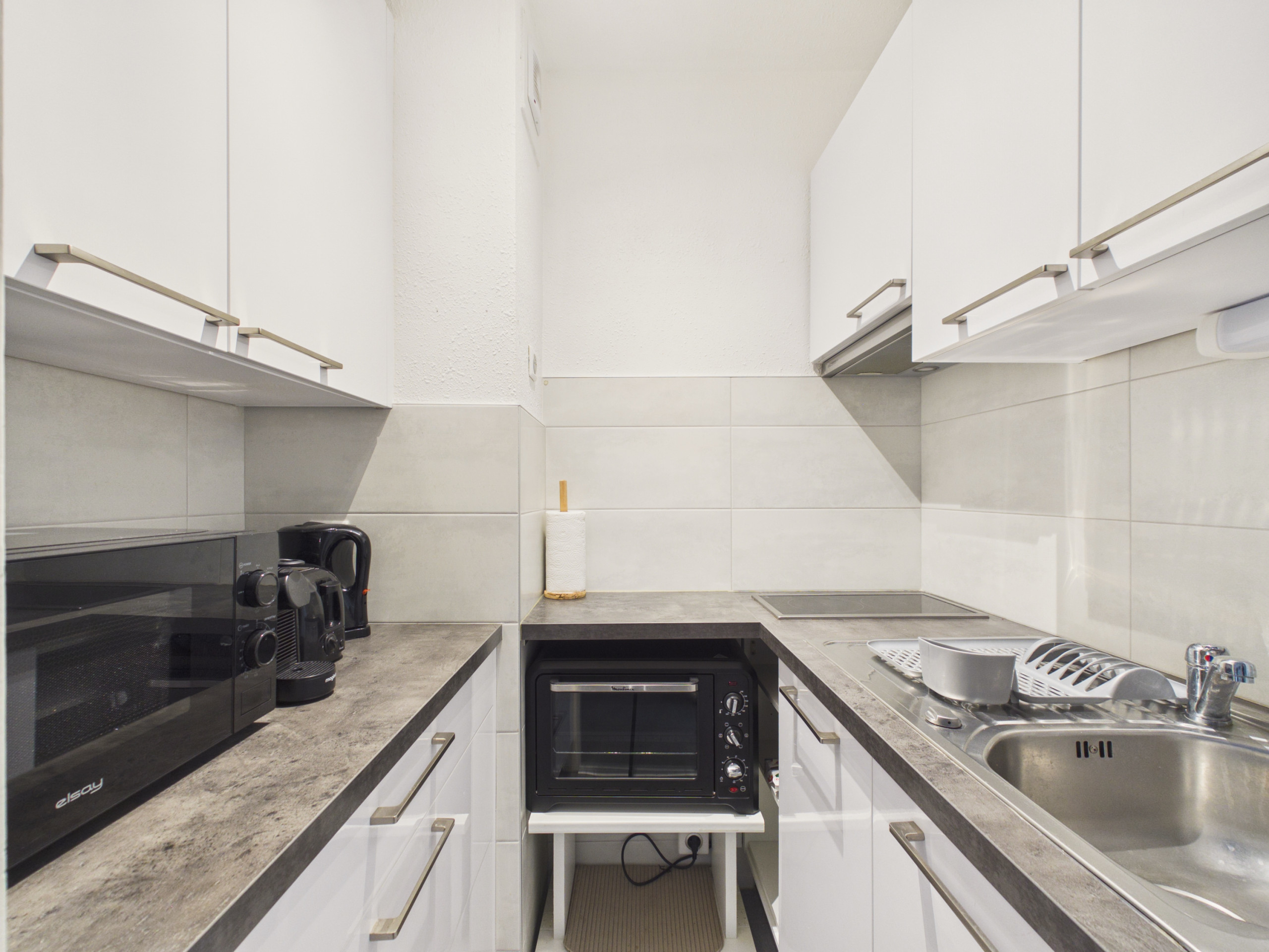 Die unabhängige und vollständig ausgestattete Kitchenette (Induktionskochplatten, Mikrowelle, Backofen) bietet Ihnen alles Notwendige zur Zubereitung Ihrer Mahlzeiten. In der Rückküche finden Sie den Kühlschrank sowie den Gefrierschrank. Zum Frühstück stehen Ihnen auch ein Wasserkocher, ein Toaster und eine Nespresso-Kaffeemaschine zur Verfügung.