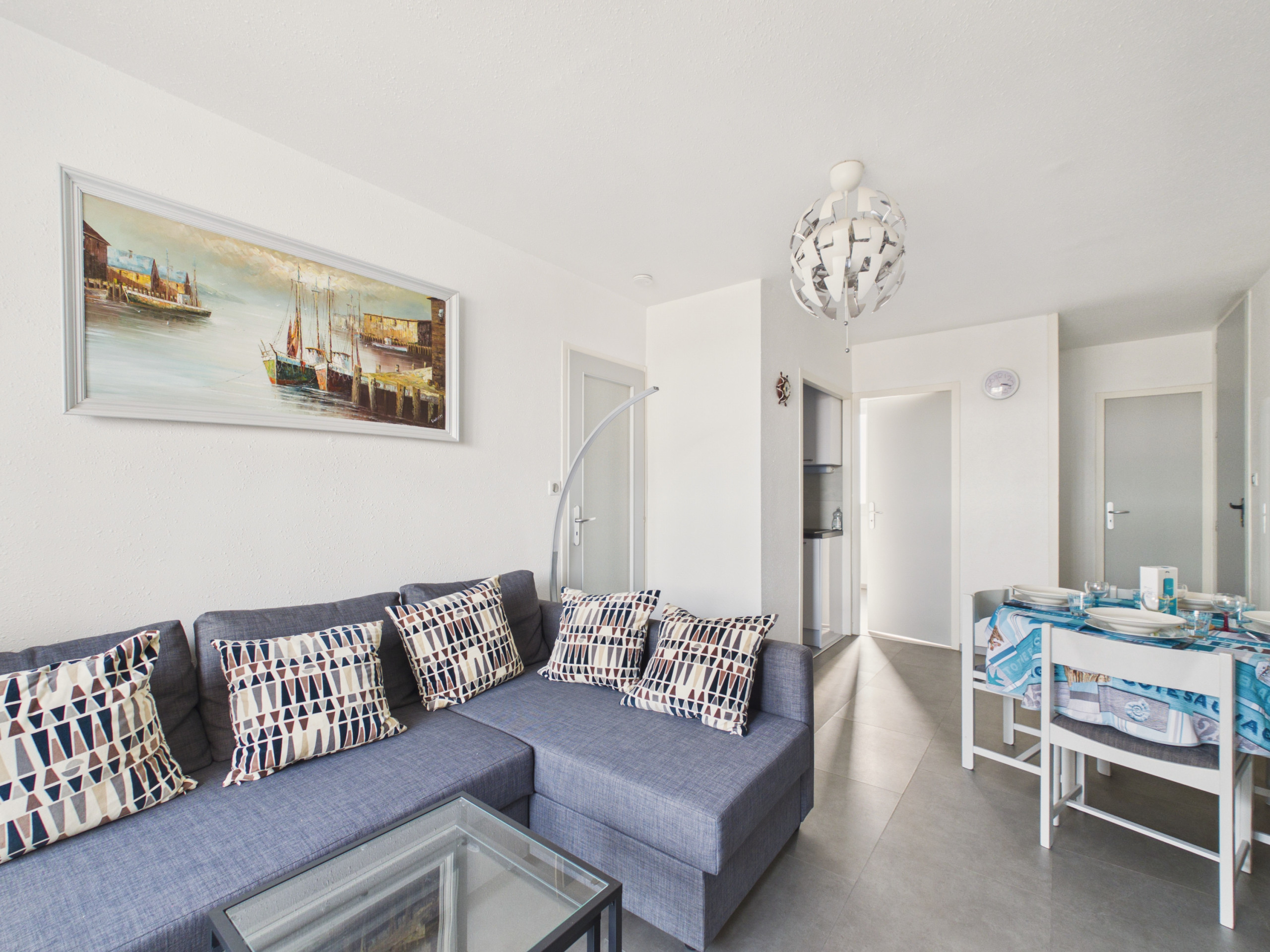 Bei Ihrer Ankunft entdecken Sie einen hellen Wohnbereich mit Zugang zum geschlossenen Balkon. Die Wohnecke, bestehend aus einem komfortablen Sofa und einem Fernseher, ist perfekt für gesellige Momente. Sie können Ihre Mahlzeiten am Tisch im Inneren einnehmen.