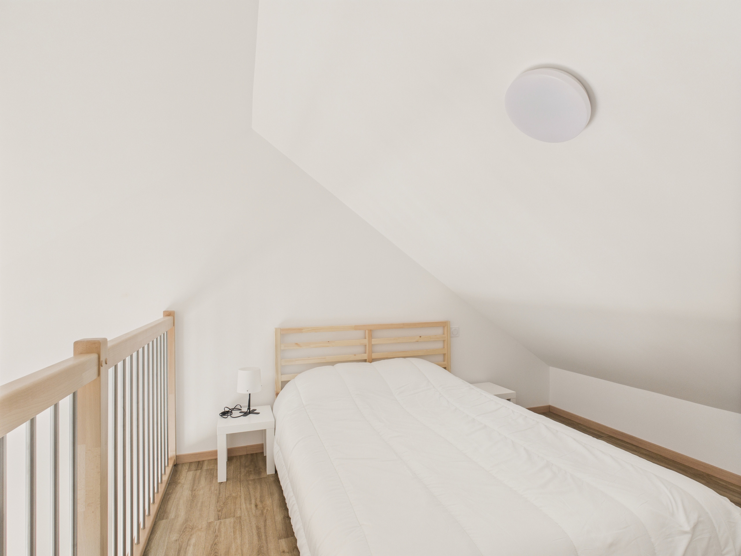 Auf der Nachtseite führt der Flur rechts vom Eingang zu einem ersten Zimmer mit einem Doppelbett (140x200) sowie zu einem Badezimmer mit Dusche, Haartrockner und einer separaten Toilette. Von der Lounge aus führt eine Treppe zu einer hübsch eingerichteten Galerie, die eine zweite Schlafgelegenheit mit einem Doppelbett (140x200) bietet. Die Gestaltung dieses Raums macht ihn ideal für ein Freundespaar oder etwas ältere Kinder.