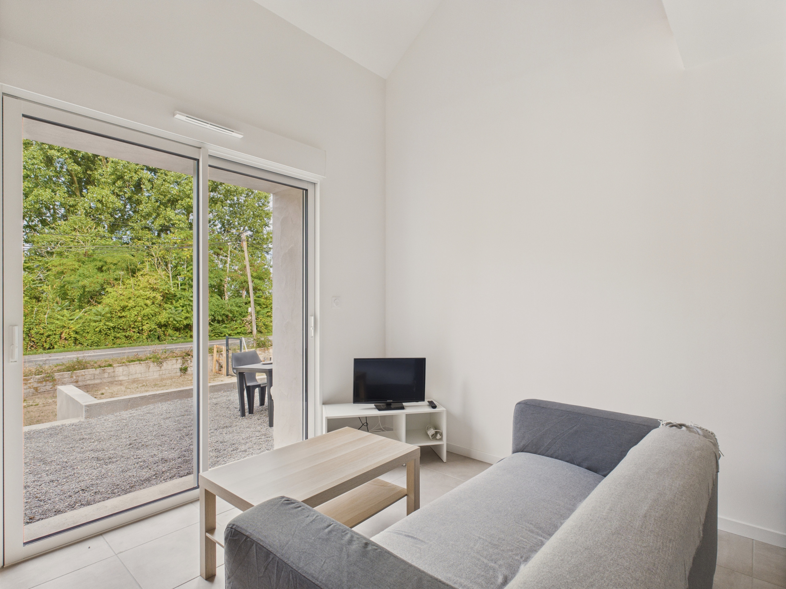 Die Unterkunft öffnet sich zu einem hellen und einladenden Wohnbereich, bestehend aus einer Lounge-Ecke mit Fernseher, einem Essbereich und einer offenen amerikanischen Küche. Dieser Raum, durchflutet von Licht durch die Glasfronten, führt direkt in den Garten.