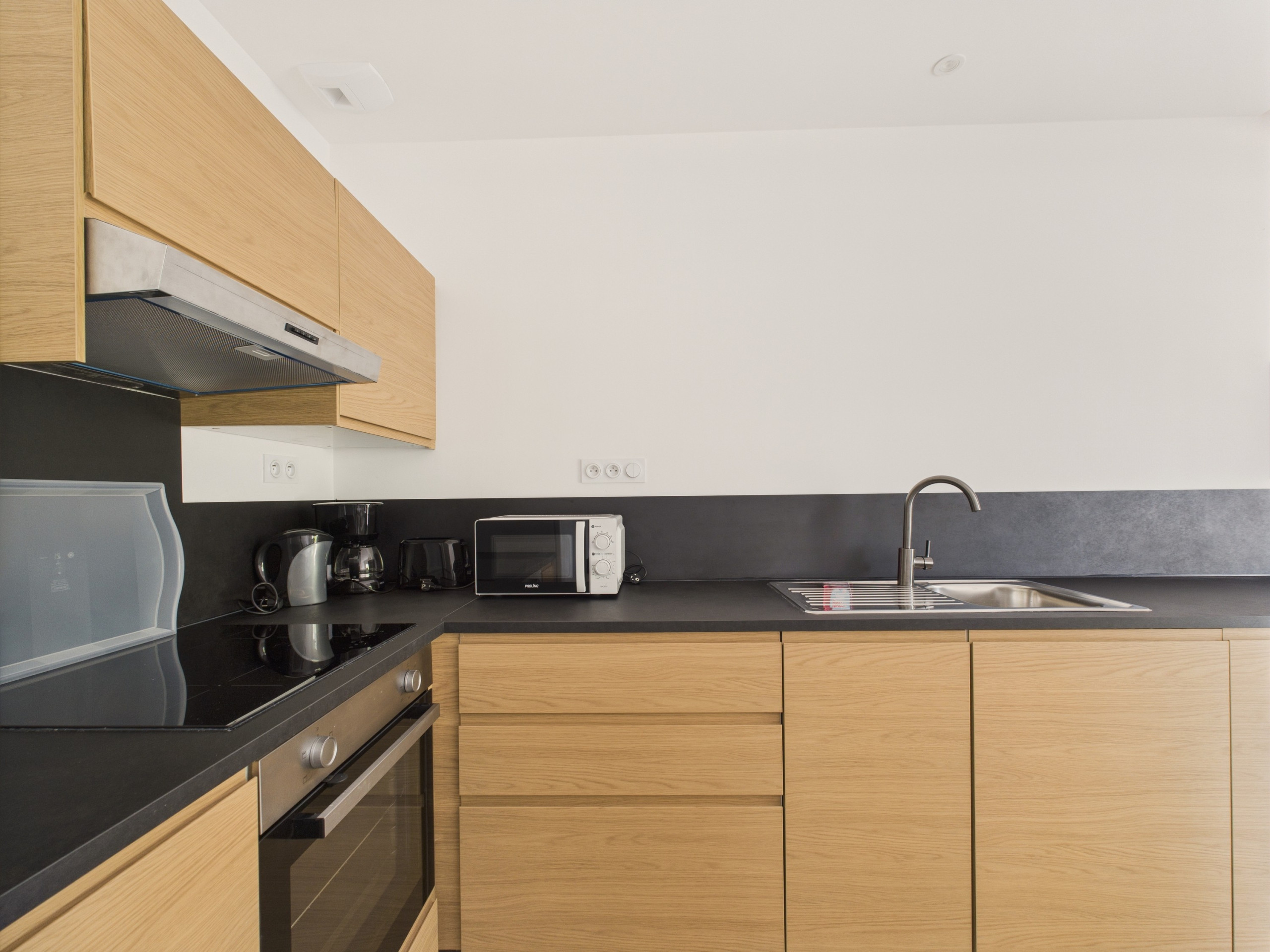 Die Küche, modern und durchdacht, verfügt über alles Notwendige, um Ihre Mahlzeiten wie zu Hause zuzubereiten: Induktionsherde, Kühlschrank, Gefrierschrank, Mikrowelle, Backofen, Geschirrspüler, Filterkaffeemaschine, Toaster, Wasserkocher, Geschirr und alle Utensilien, die Sie benötigen könnten.