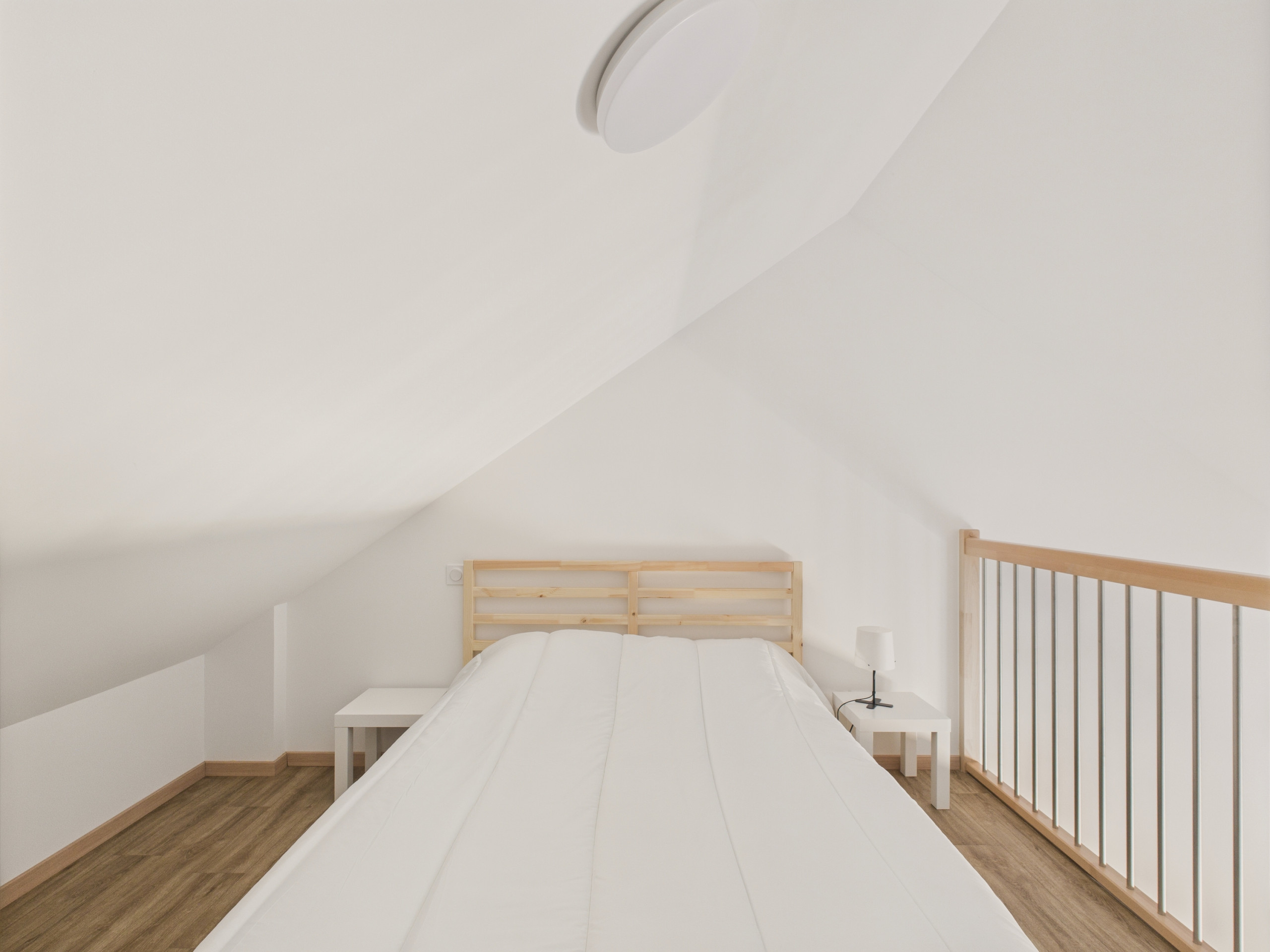 Links vom Eingang führt ein Flur zu einem ersten Schlafzimmer mit einem Doppelbett (140x200), einem modernen Badezimmer mit Dusche und Föhn sowie einer separaten Toilette. Eine Treppe im Wohnzimmer führt zu einer Galerie mit einem zweiten Doppelbett (140x200), das zusätzlichen Schlafplatz für 2 Personen bietet.