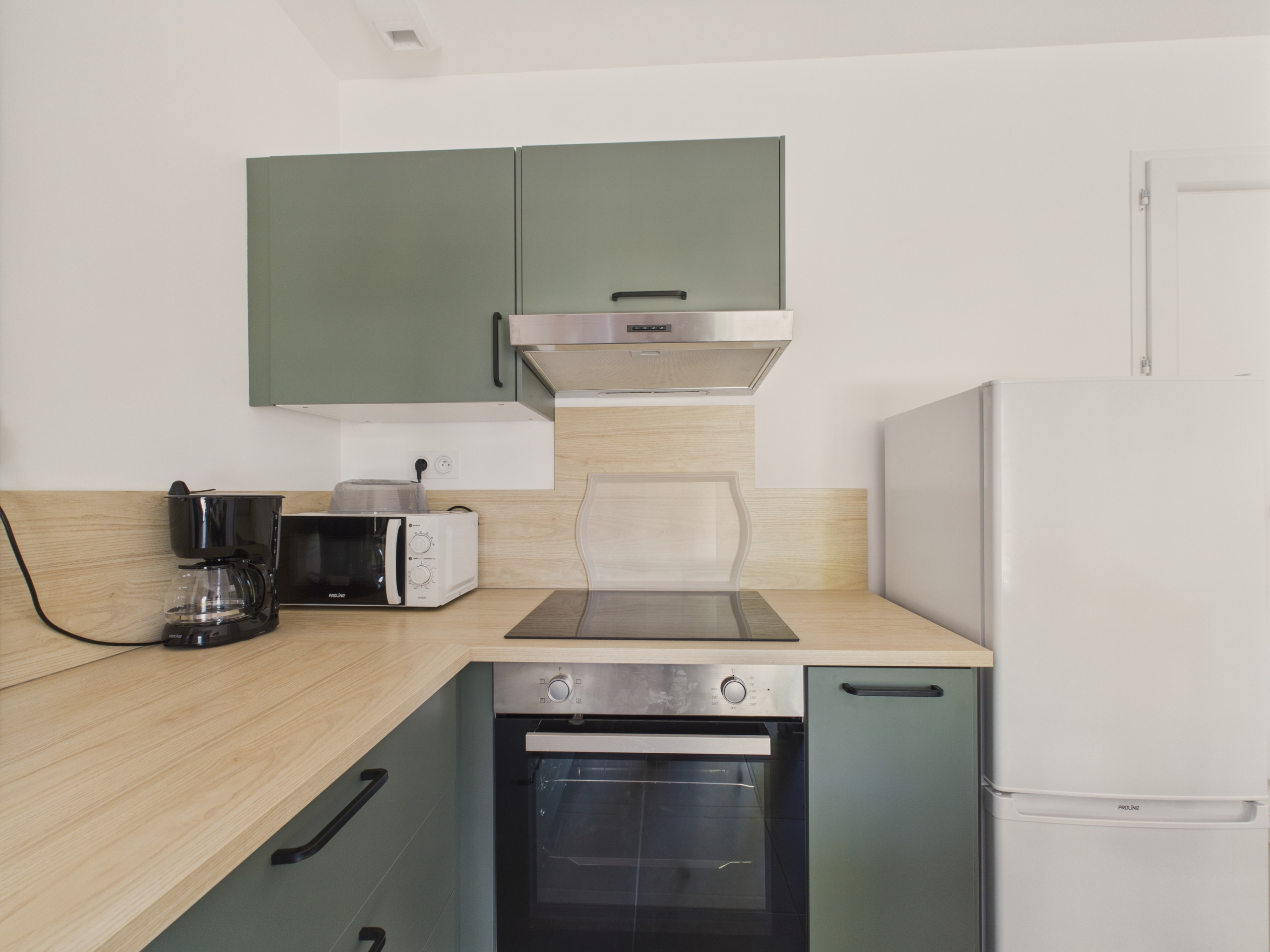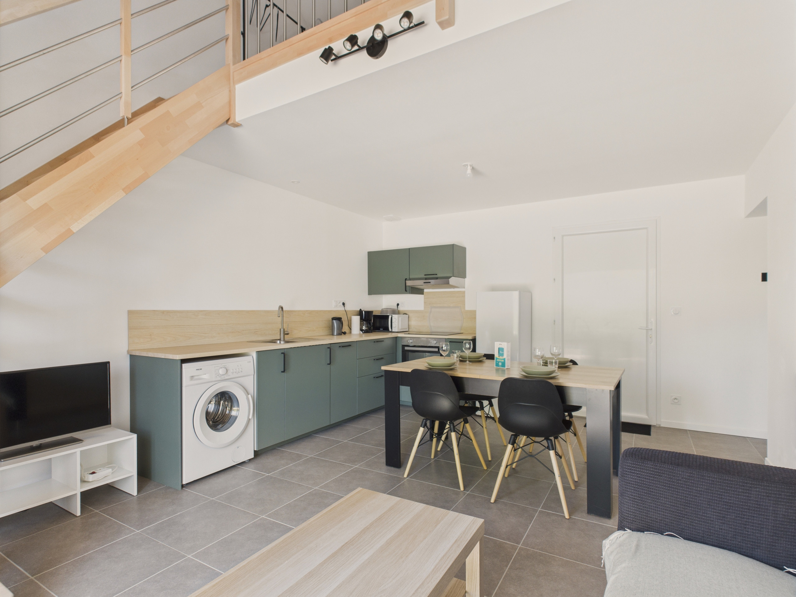 Sie finden eine gut ausgestattete Küche (Induktionsherde, Kühlschrank, Mikrowelle, Gefrierschrank, Geschirrspüler, Kaffeemaschine, Toaster, Wasserkocher und Zitrusspresse), um leckere Mahlzeiten zuzubereiten. Sie ist offen zu einem runden Tisch, an dem Sie sich gerne versammeln werden, um diese köstlichen Gerichte zu genießen und Momente des Lachens zu teilen. Anschließend ermöglicht Ihnen das Wohnzimmer eine Pause vor dem Fernseher. Wenn der Abend kommt, können Sie das Sofa ausklappen, um sich dort für die Nacht einzukuscheln. Schließlich finden Sie ein Schlafzimmer mit einem Doppelbett in hellen Tönen und ein Badezimmer, um sich nach Ihrer Rückkehr vom Strand eine gute Dusche zu gönnen.