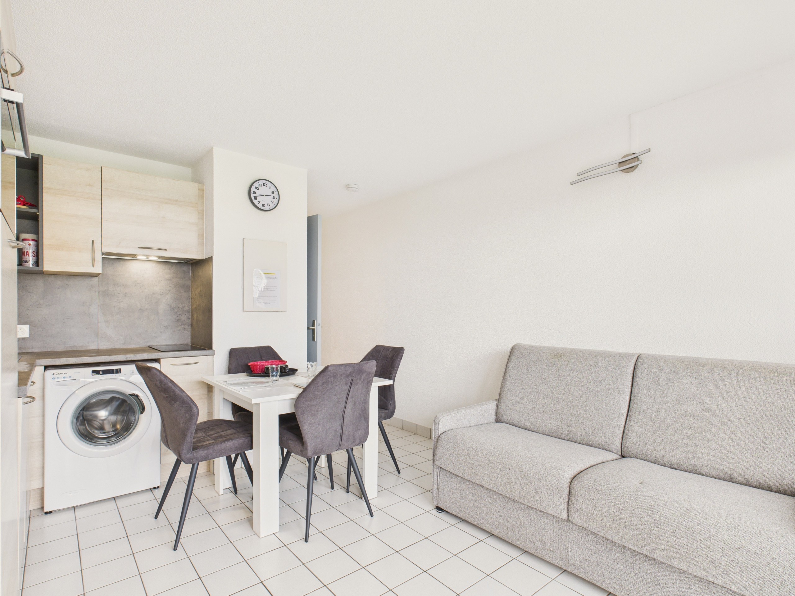 Betreten Sie die Eingangstür und entdecken Sie den Wohnbereich mit direktem Zugang zur Terrasse. Die offene, vollständig ausgestattete Küche (Kühlschrank, Ofen, Mikrowelle, Glaskeramikkochfeld, Geschirrspüler) bietet alles Notwendige, um Ihre Mahlzeiten wie zu Hause zuzubereiten. Zum Frühstück stehen Ihnen auch ein Wasserkocher, ein Toaster und eine Senseo-Kaffeemaschine zur Verfügung. Teilen Sie Ihre Mahlzeiten am Esstisch drinnen oder ziehen Sie an schönen Tagen den Tisch auf der Terrasse vor. Am Abend entspannen Sie sich in der Lounge-Ecke, gemütlich auf dem Sofa sitzend vor dem Fernseher.