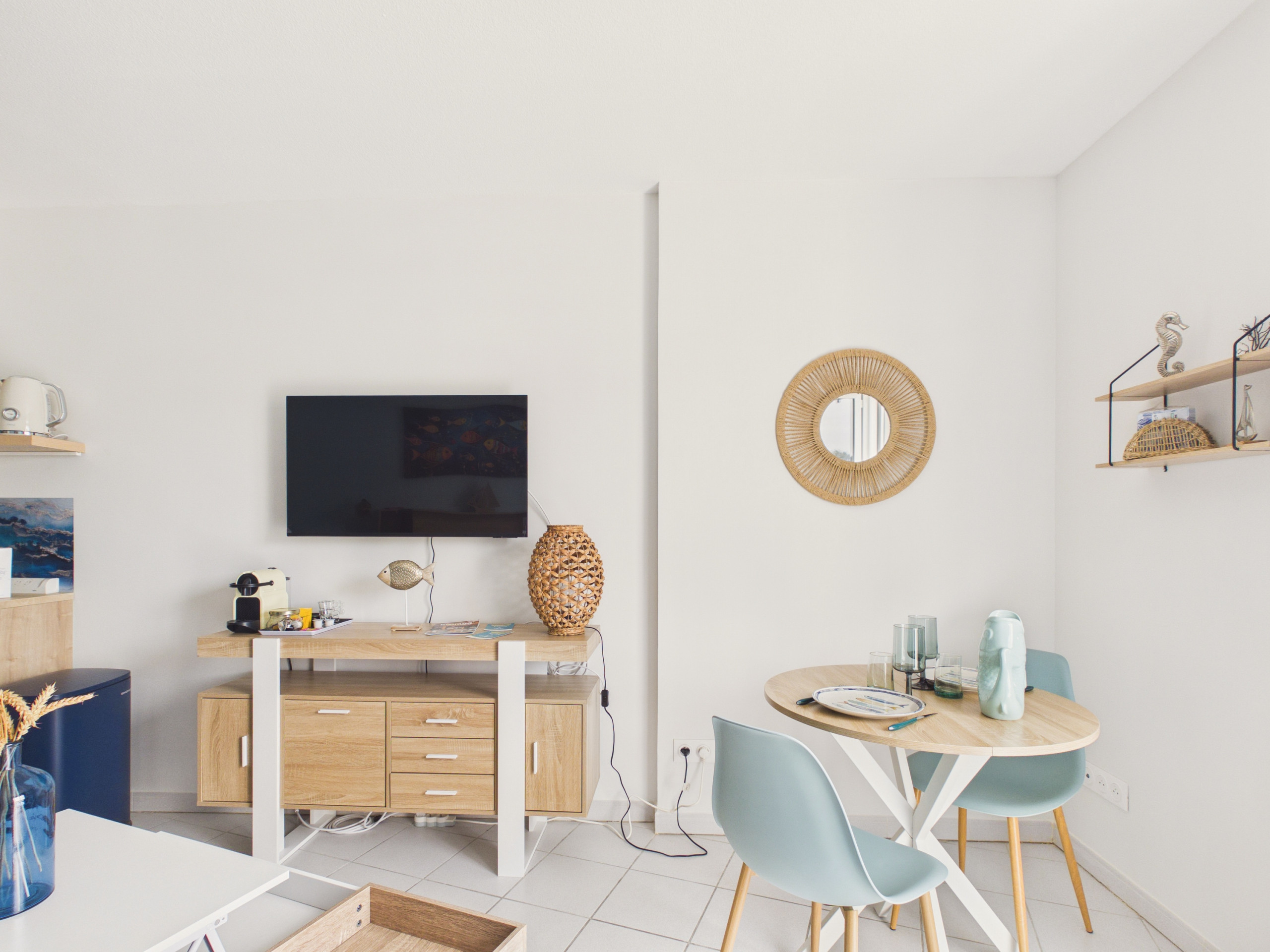 Im Inneren werden Sie einen hellen und funktionalen Wohnbereich entdecken. Der Wohnbereich besteht aus einem gemütlichen Sofa, einem großen Fernseher und einem runden Tisch für 2 Personen. Eine große Glasfront bringt schönes Licht und bietet direkten Zugang zur Terrasse.
