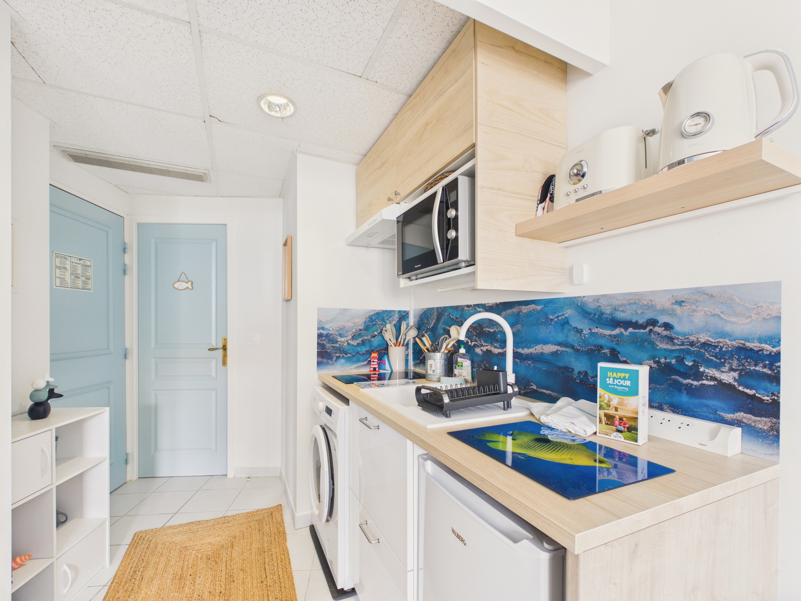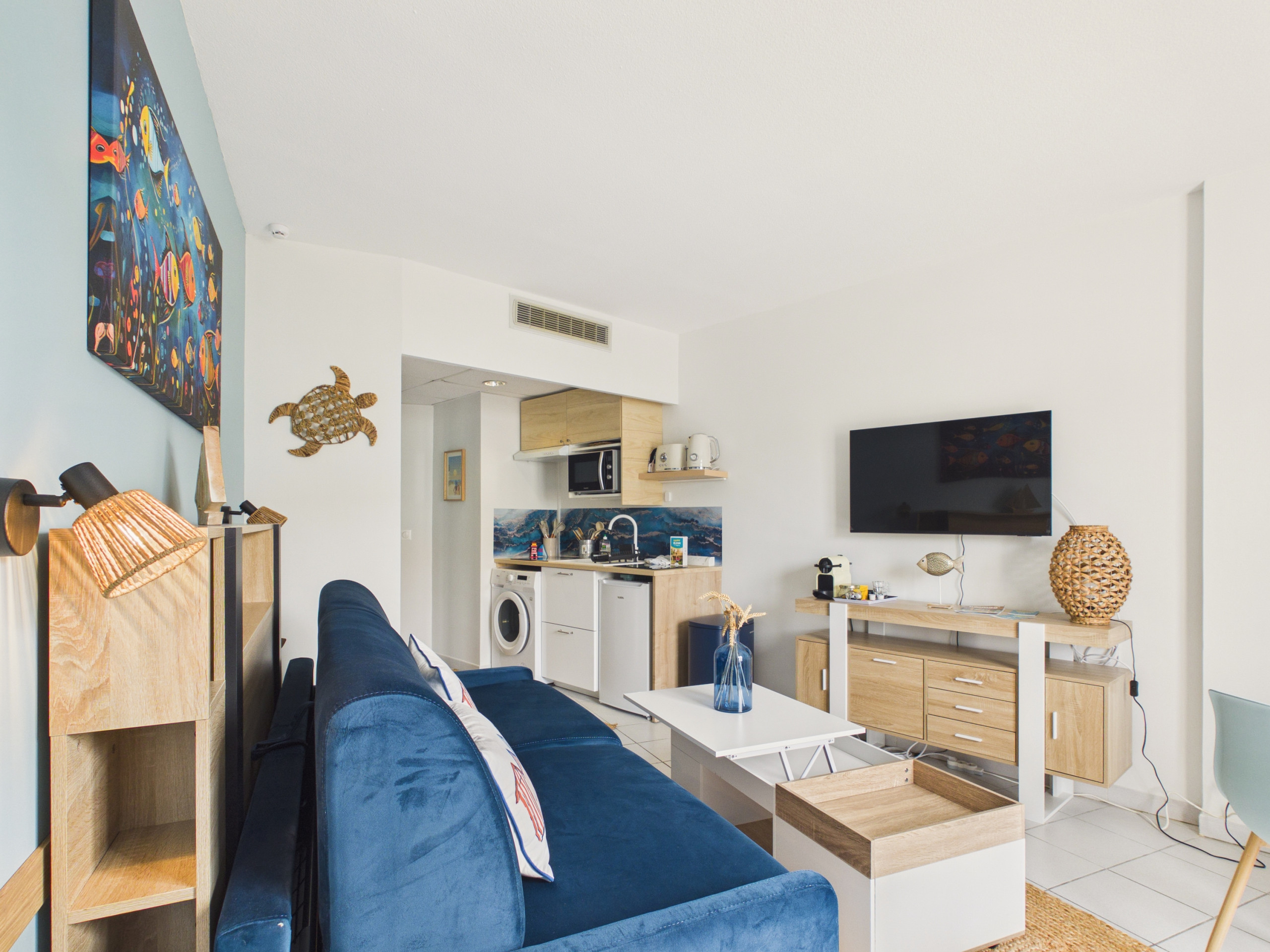 Die offene Küche, die zum Wohnbereich hin offen ist, ist komplett ausgestattet: Induktionsherde, Kühlschrank mit Gefrierfach, Kombi-Mikrowellenherd, Nespresso-Kaffeemaschine, Toaster und Wasserkocher.
