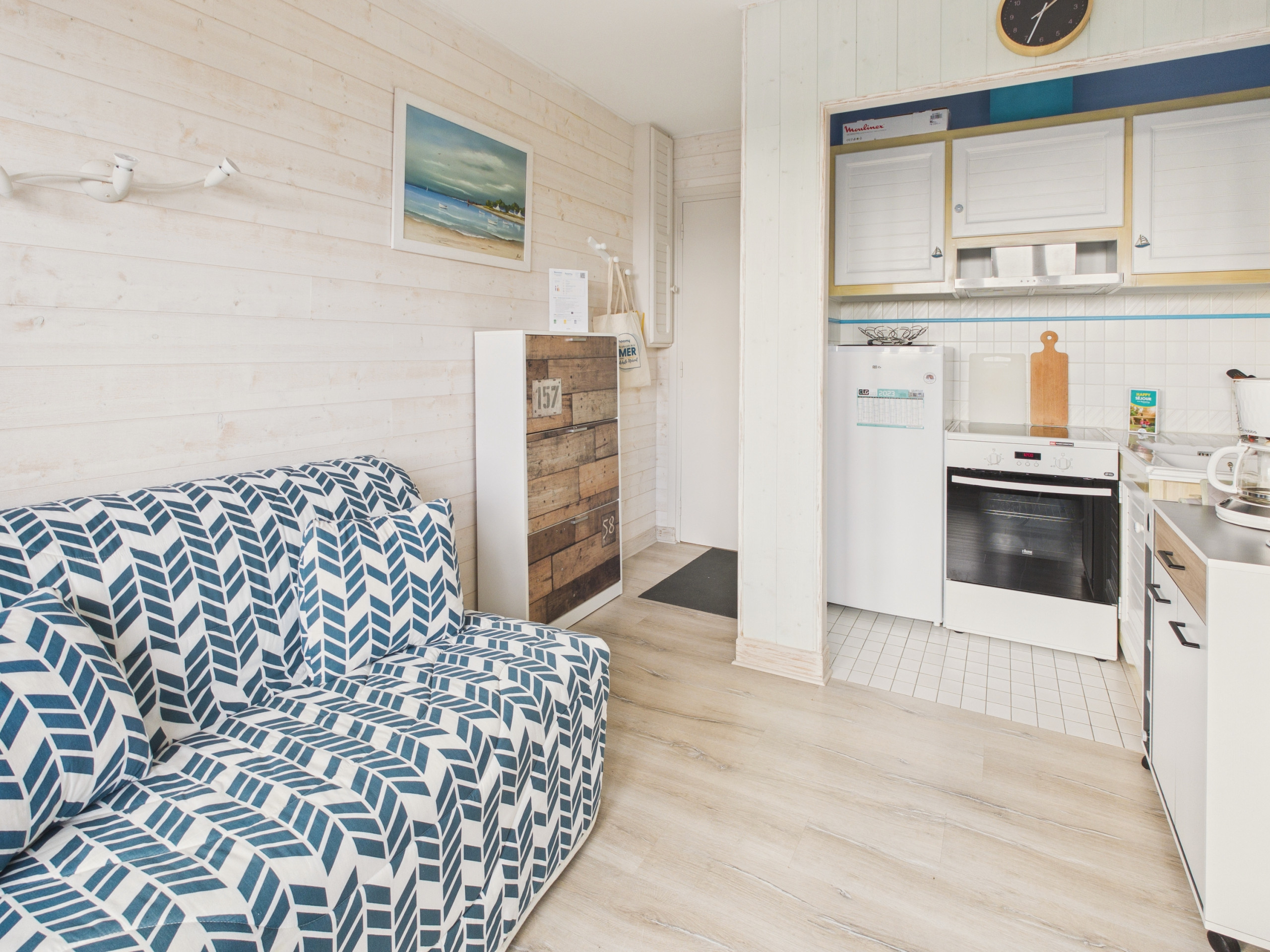 Ein erster Schlafbereich, der durch einen Vorhang vom Wohnbereich getrennt ist, ist mit einem Doppelbett (140x190 cm) ausgestattet, während das Schlafsofa im Wohnzimmer zwei zusätzliche Personen aufnehmen kann.