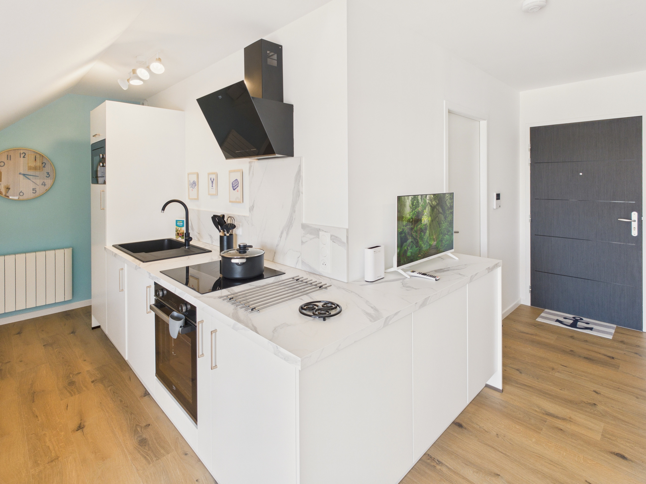 Betreten Sie die Eingangstür und entdecken Sie einen schönen, modern eingerichteten Wohnbereich, der Zugang zu einem Balkon mit Blick auf den Hafen bietet. Die offene Küche ist vollständig ausgestattet (Kühlschrank, Ofen, Mikrowelle, Induktionsherde) und bietet Ihnen alles Notwendige zur Zubereitung Ihrer Mahlzeiten. Zum Frühstück stehen Ihnen auch ein Wasserkocher, ein Toaster und eine Filterkaffeemaschine zur Verfügung. Teilen Sie Ihre Mahlzeiten am Esstisch oder genießen Sie bei schönem Wetter den Balkon. Zur Entspannung können Sie es sich gemütlich auf dem Sofa vor dem Fernseher machen.