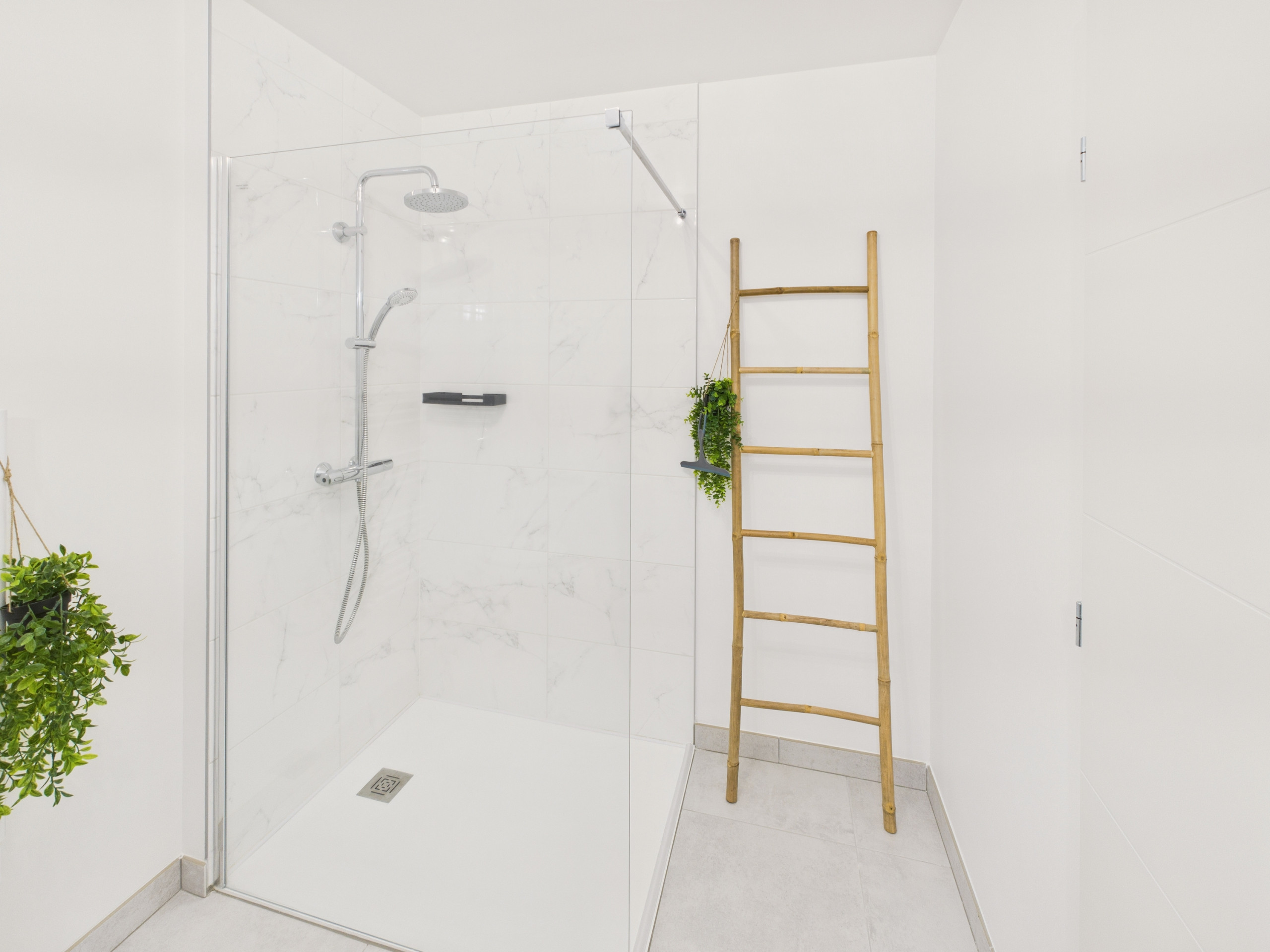 Das Badezimmer ist mit einer großen Dusche, einer Toilette und einem Föhn ausgestattet.