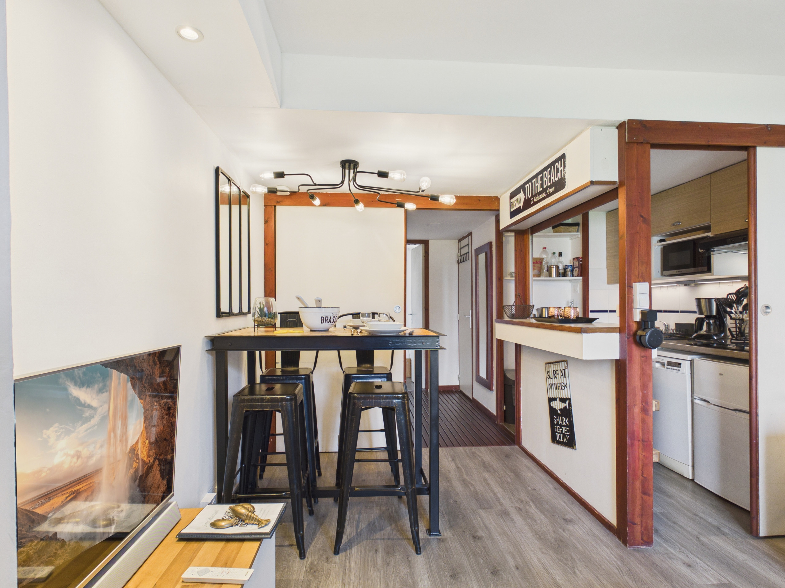 Pass through the entrance door and discover a charming living area of 20 m² with direct access to the balcony. The kitchen, modern and open, is fully equipped (refrigerator, freezer, oven, microwave, dishwasher) and provides you with everything necessary to cook as if at home. Share your meals around the dining table or, on beautiful days, enjoy the one on the balcony. Extend the evening in the cosy living area, equipped with a comfortable sofa and a television.