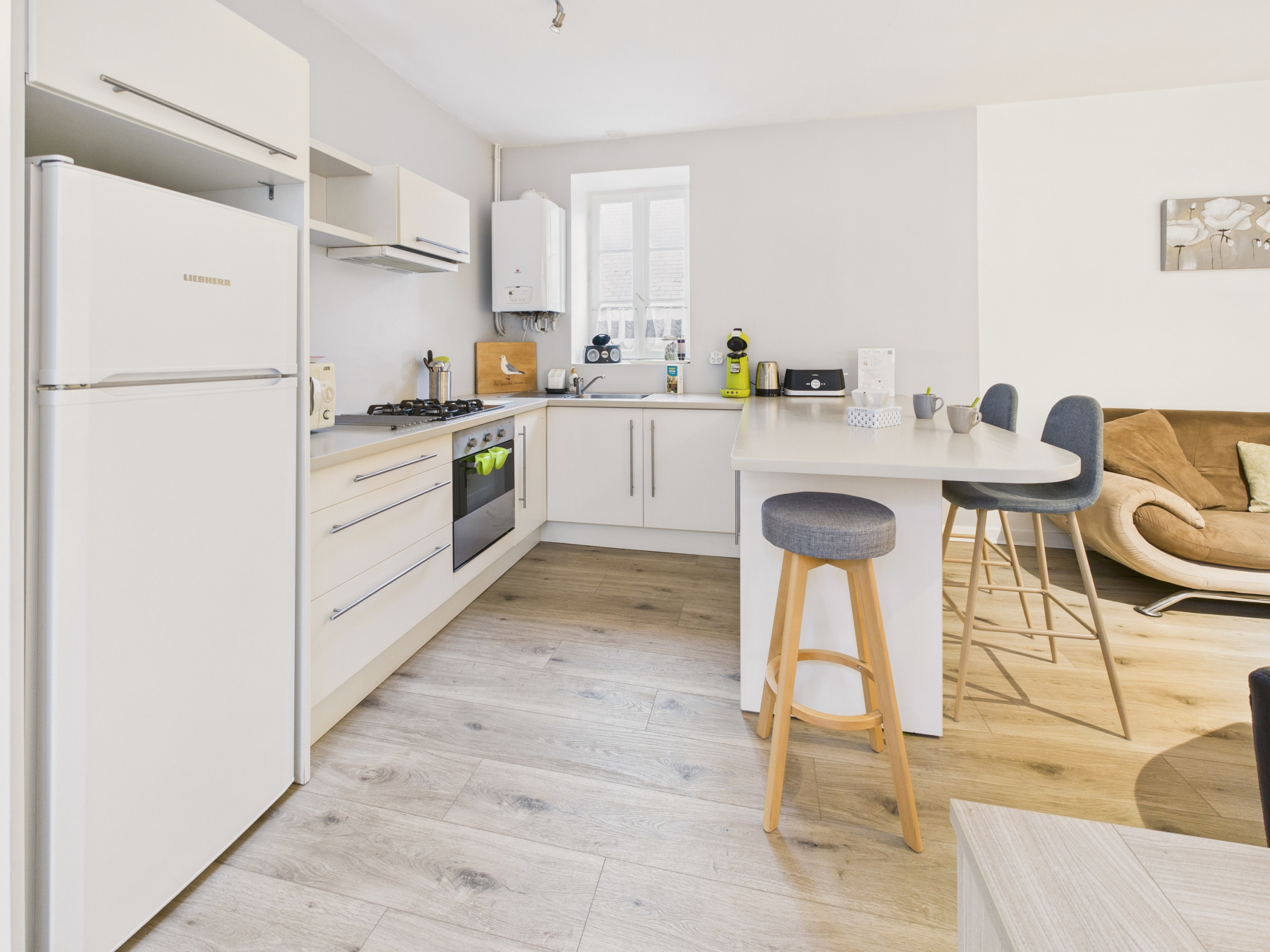 Enter through the entrance door and discover a beautiful and spacious living room of 38 m². The open kitchen, fully equipped (refrigerator, freezer, microwave, oven, gas hobs and raclette appliance), offers you everything you need to prepare your meals. For breakfast, you will also have a kettle, a toaster, a filter coffee maker and a Senseo machine. Share your meals around the dining table or, on beautiful days, on the terrace. In the evening, gather in the lounge area, comfortably seated on the sofas facing the television.