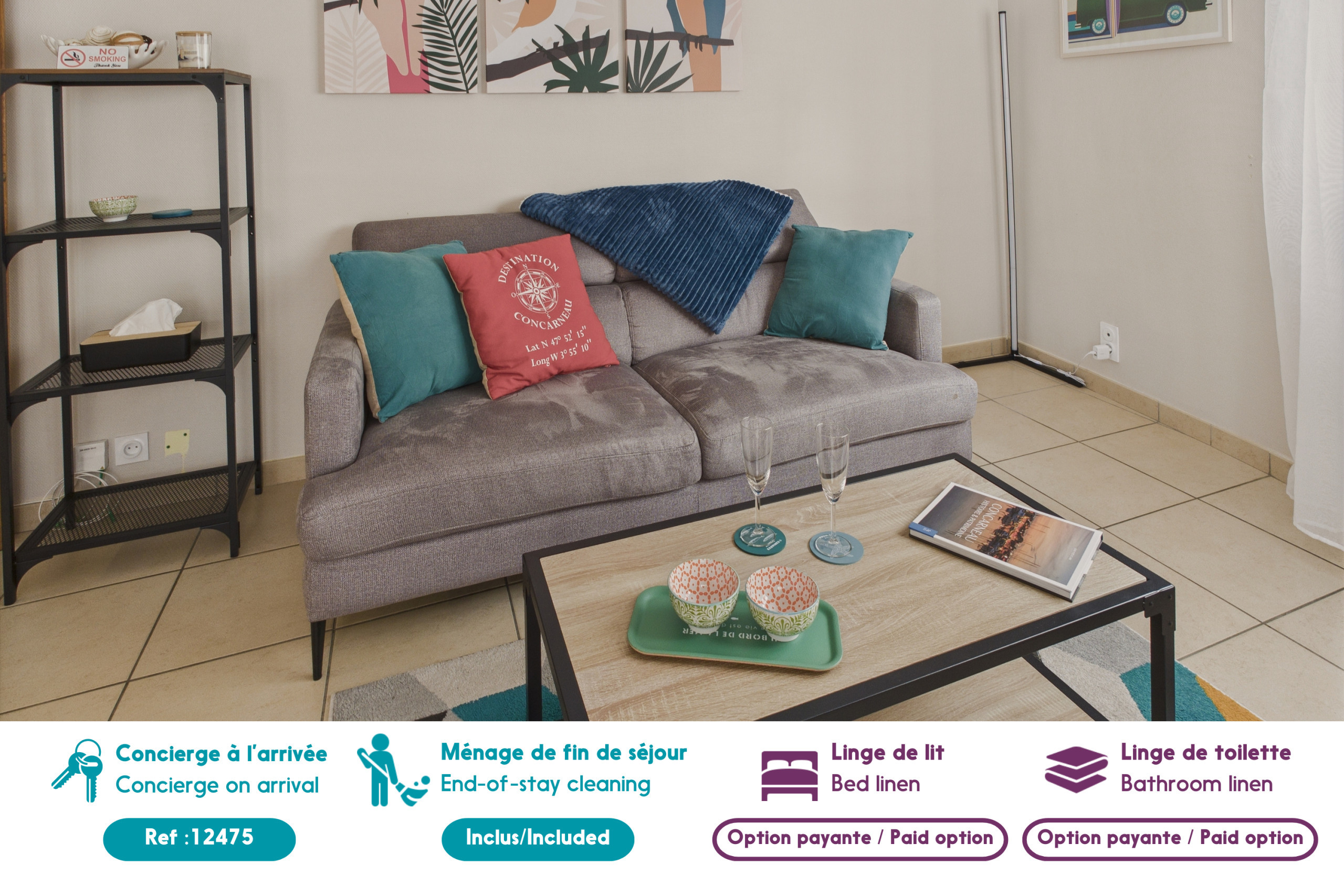 Once in the apartment, you will discover on your right an independent fully equipped kitchen: refrigerator, freezer, oven, microwave, toaster, kettle, filter coffee maker and all the necessary utensils to prepare your meals independently. On your left, a beautiful living room welcomes you with a distant view of the ocean. You can share your meals around the dining table or relax in the living area, comfortably seated on the sofa in front of the television.
