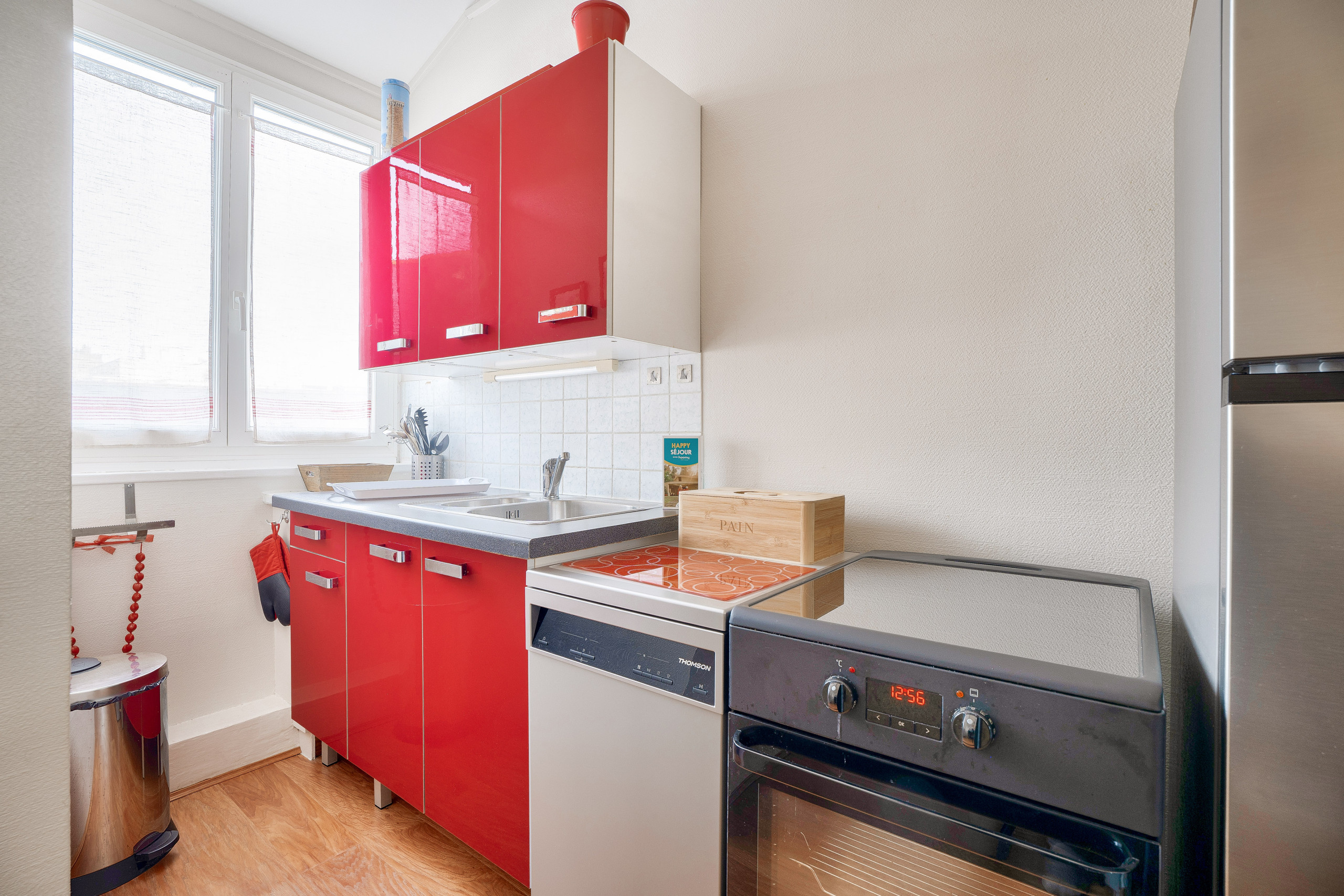 As soon as you enter, let yourself be seduced by the beautiful living space bathed in natural light. The lounge, welcoming and friendly, is designed for your moments of relaxation after a day at the beach or exploring. You will find a comfortable sofa, a television and direct access to a balcony fitted with a small table and chairs to enjoy the fresh air. The open, modern and functional kitchen is equipped with induction hobs, refrigerator, microwave, oven, Senseo coffee maker, toaster, kettle and all the necessary utensils to prepare delicious meals with simplicity.