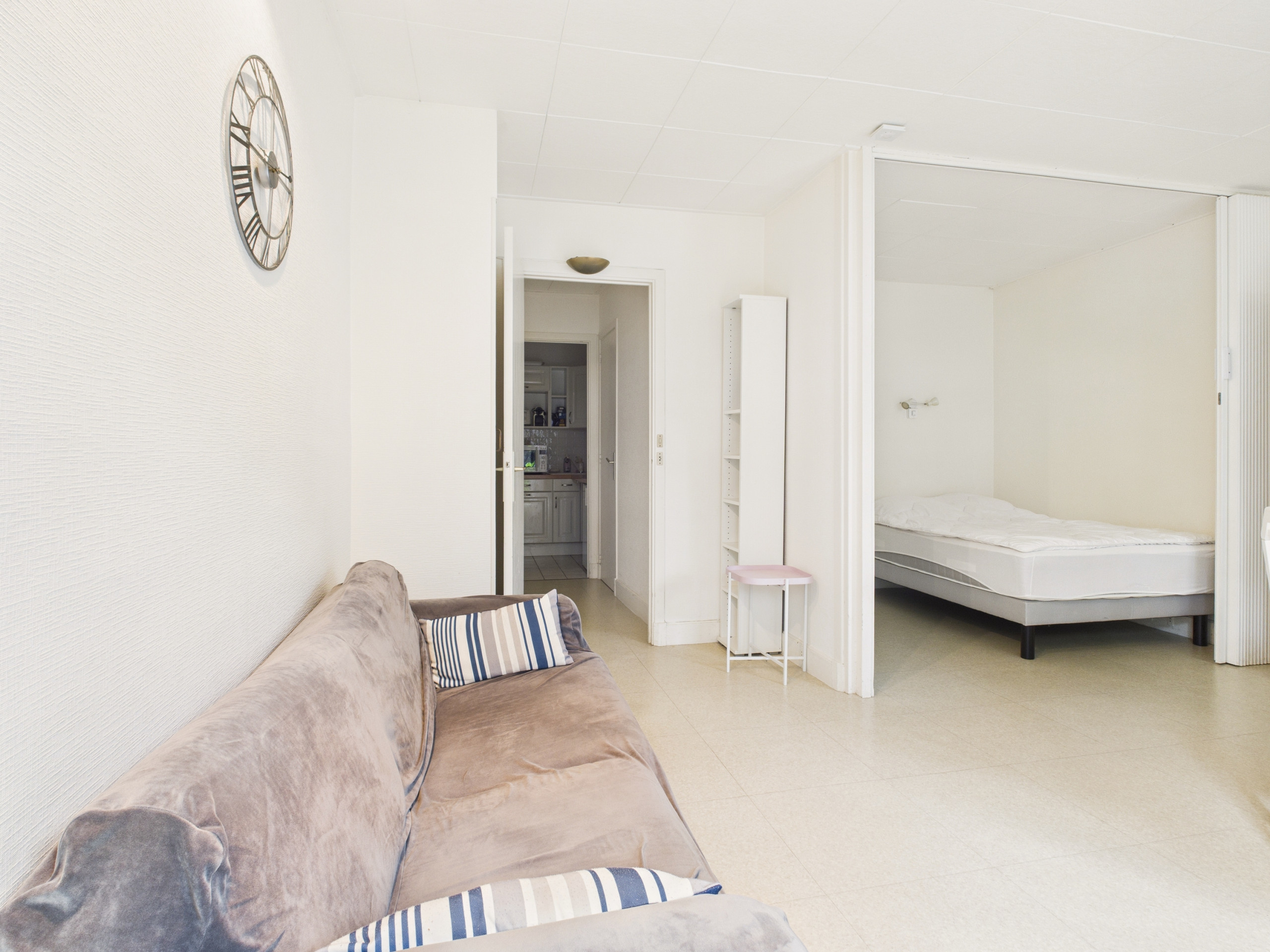 In this apartment, you will discover the living area with a sofa corner, a dining area and a double sofa bed (140 x 190) located in a corner of the room. A small sliding door allows you to close this space for the night. You will access a small terrace of 10 m² from this room.
