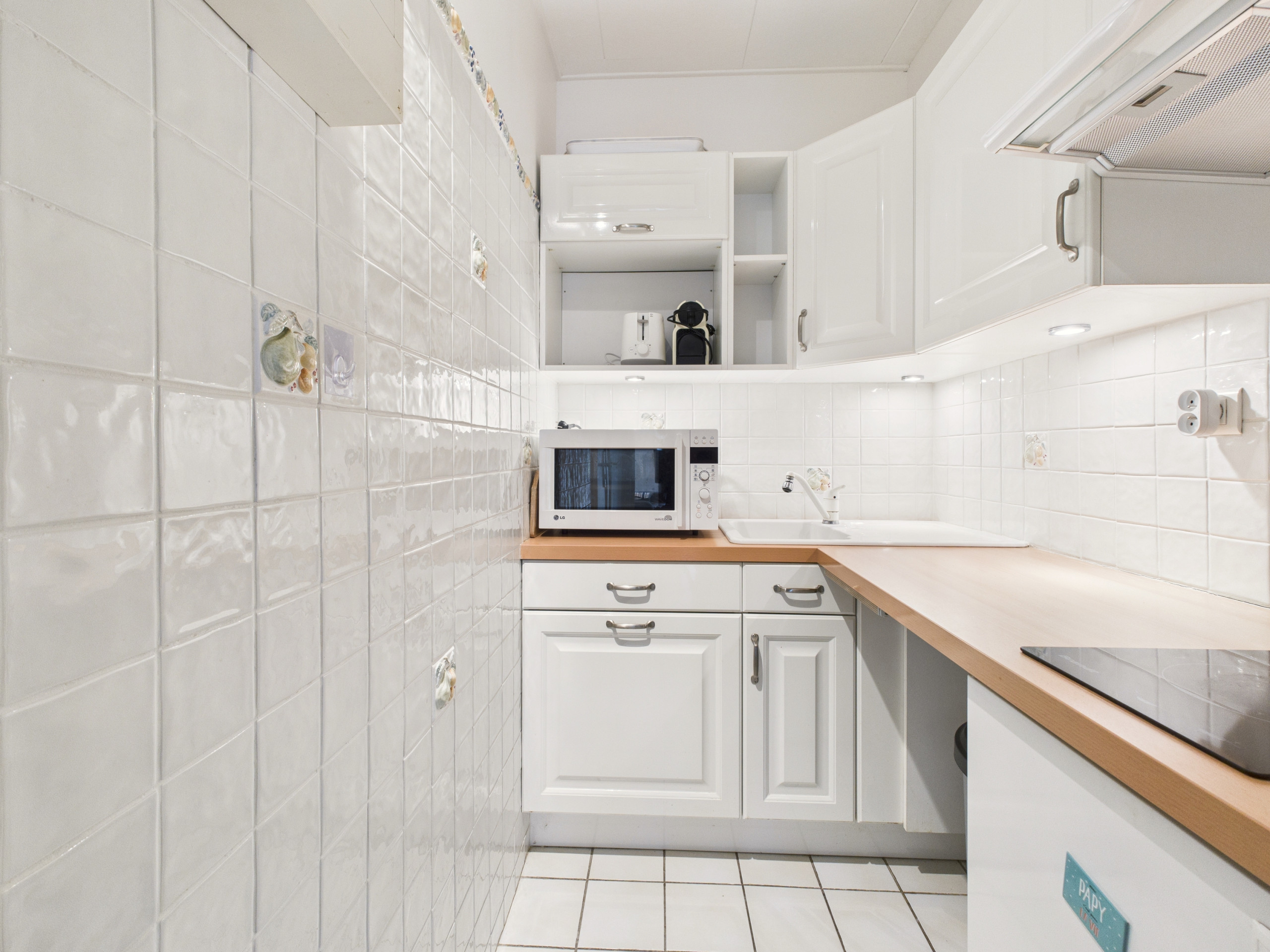You will also find a well-equipped kitchen area, including induction hobs, a microwave, a toaster and a Nespresso coffee maker.