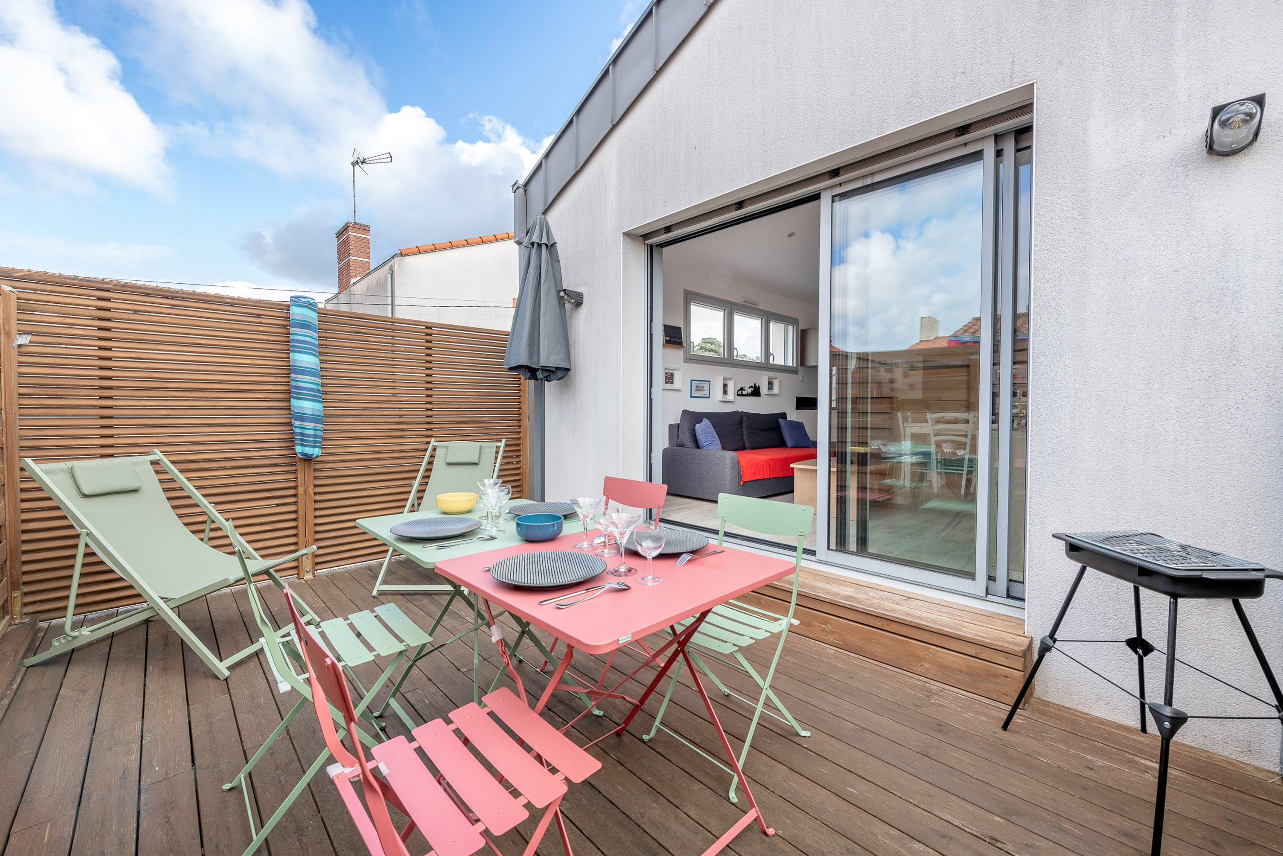 Upstairs, the open kitchen overlooking the TV lounge provides access to the 15m² wooden terrace without overlooking, with outdoor furniture and parasol. The fitted kitchen is equipped with induction hobs, an oven, a fridge-freezer, a microwave, a filter coffee maker, a toaster, a kettle, a citrus press, a raclette appliance, and all necessary kitchen equipment. An independent toilet completes the rental. For maximum comfort, a hairdryer, a washing machine, an electric barbecue, an ironing table and iron are also provided. You have a private and covered parking space.