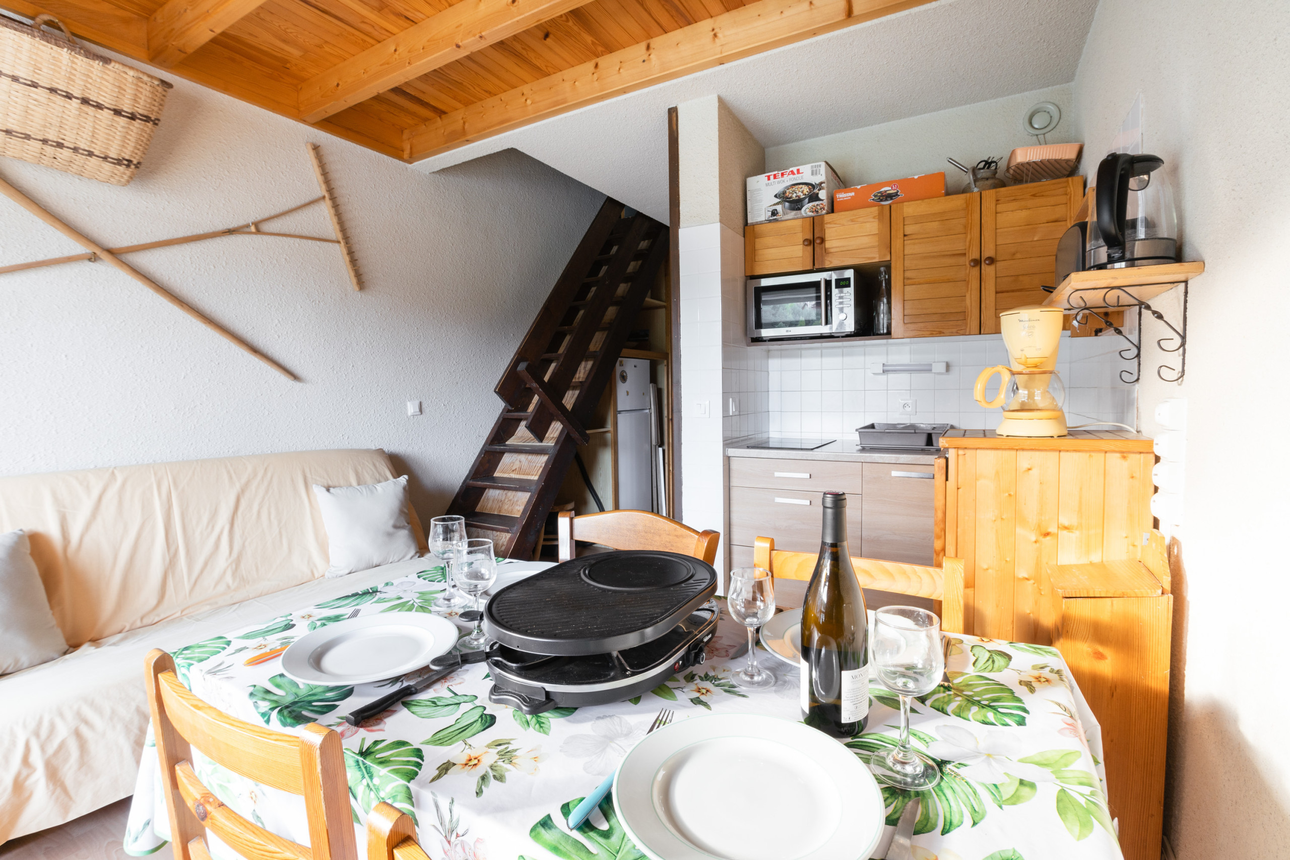 Upon entering, you will discover the “mountain corner”, a sleeping area with bunk beds offering two beds (90 x 190). You then access the living room, including the kitchen and the dining room. To prepare your meals, you will find an induction hob, oven, microwave, as well as a refrigerator and dishwasher. For breakfast, a kettle, toaster and filter coffee maker will get the day off to a good start. For convivial and gourmet evenings, a raclette machine is also available.