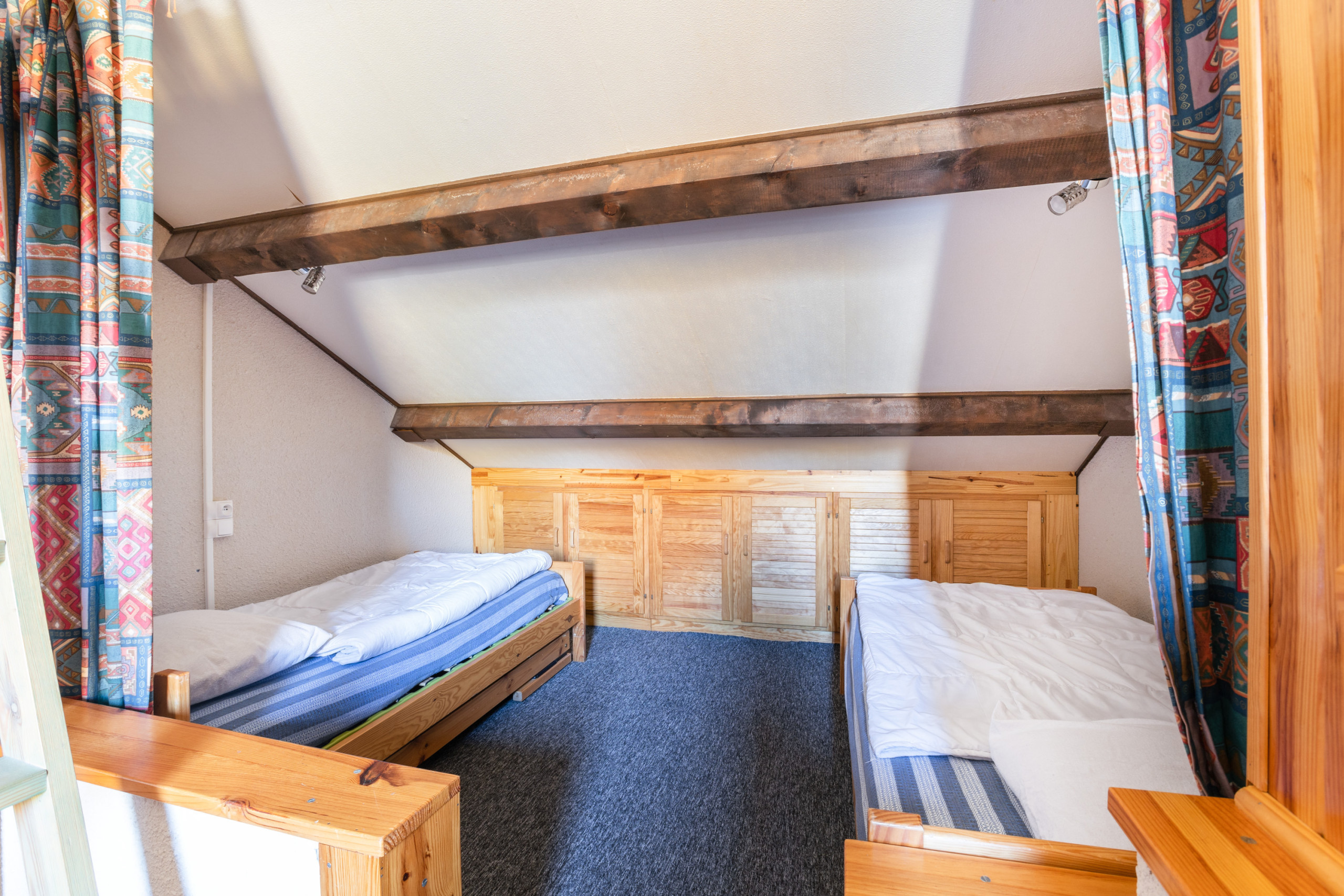 Upstairs, you will find the sleeping area comprising a bedroom with a double bed (140x190), topped with a single bed (90x190). Just next to it, behind curtains, another sleeping area houses two single beds (90x190), ideal for children. A complete bathroom also completes the apartment.