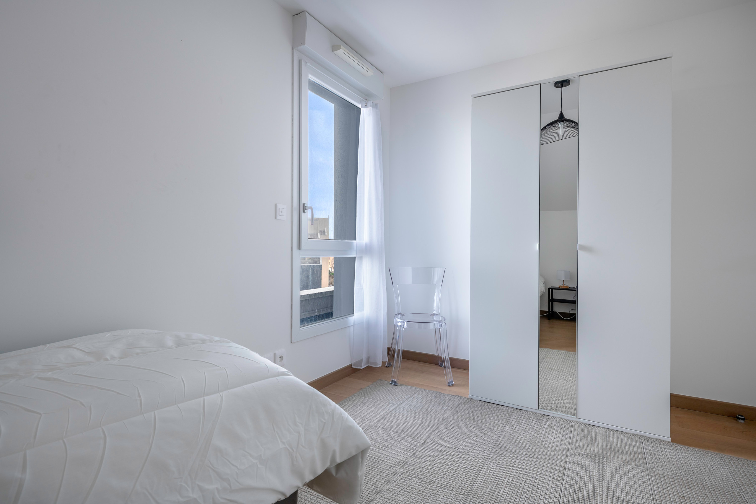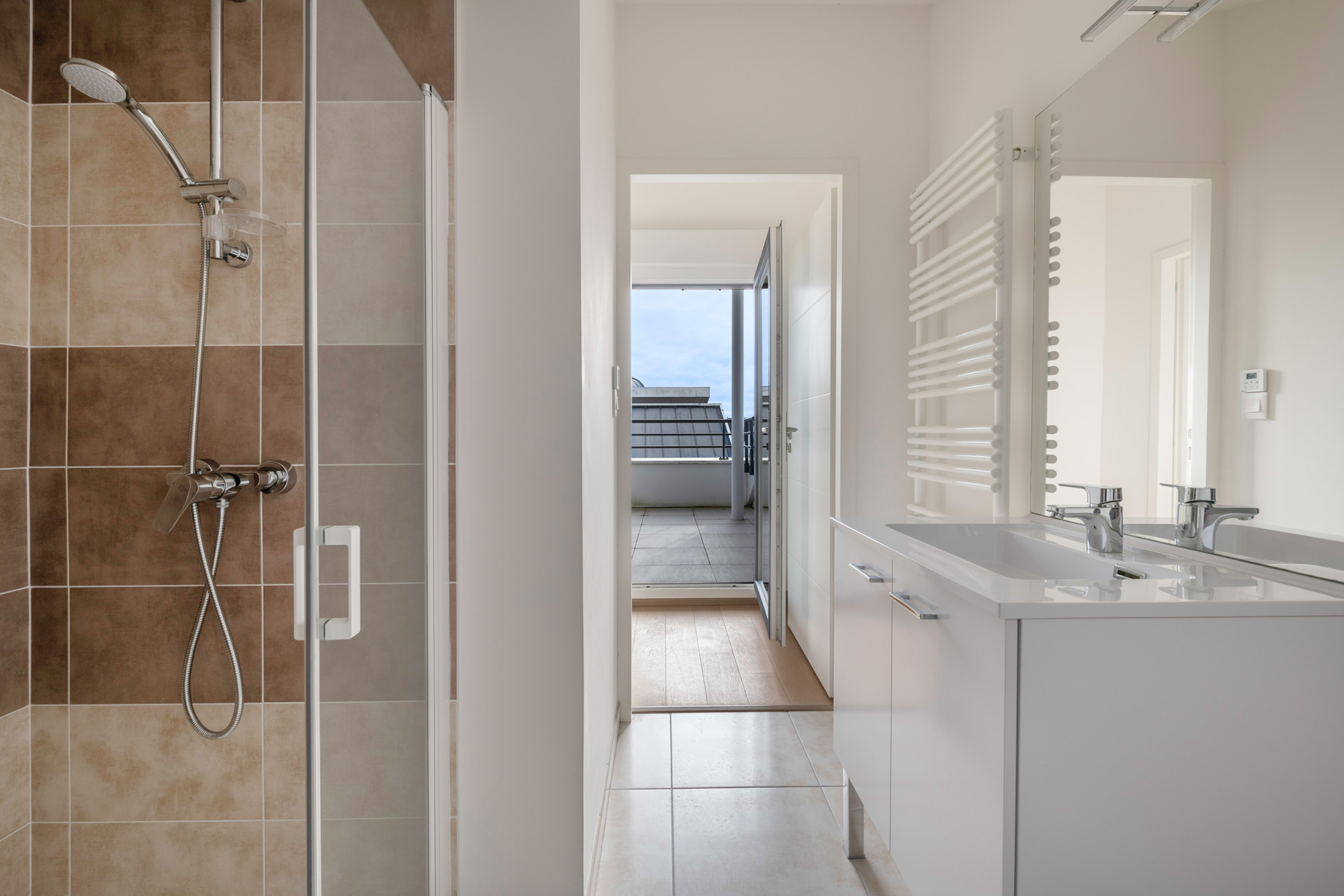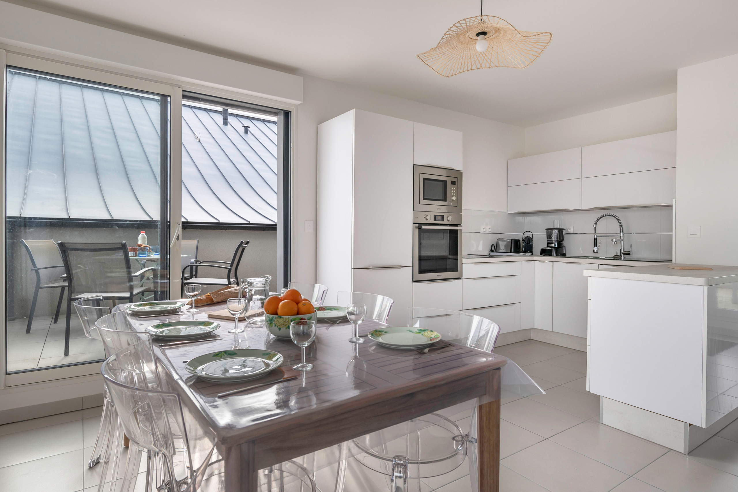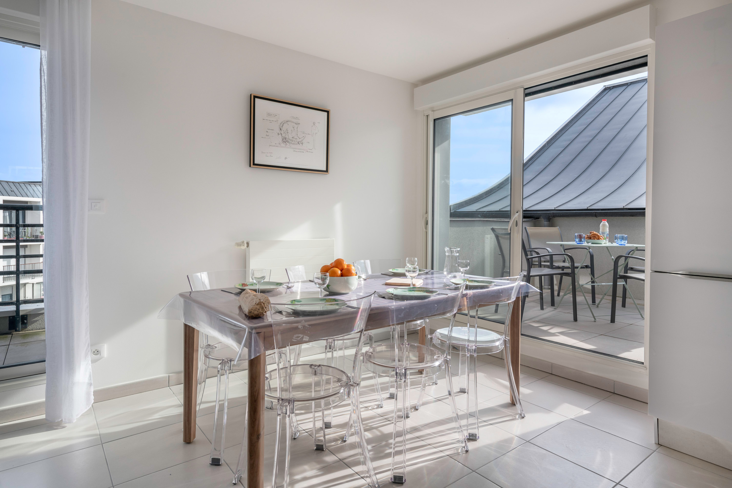 Located on the 4th floor of the building (with lift), the apartment offers a beautiful clear view of the sky and two outdoor spaces. On the first level, you will find two balconies: the first is perfect for enjoying breakfast outdoors. It overlooks the living area, consisting of a cosy living room with a comfortable sofa for a TV break, a friendly dining room and a fully equipped modern open-plan kitchen: induction hob, refrigerator, microwave, oven, freezer, dishwasher, Nespresso coffee machine, filter coffee machine, toaster and kettle.