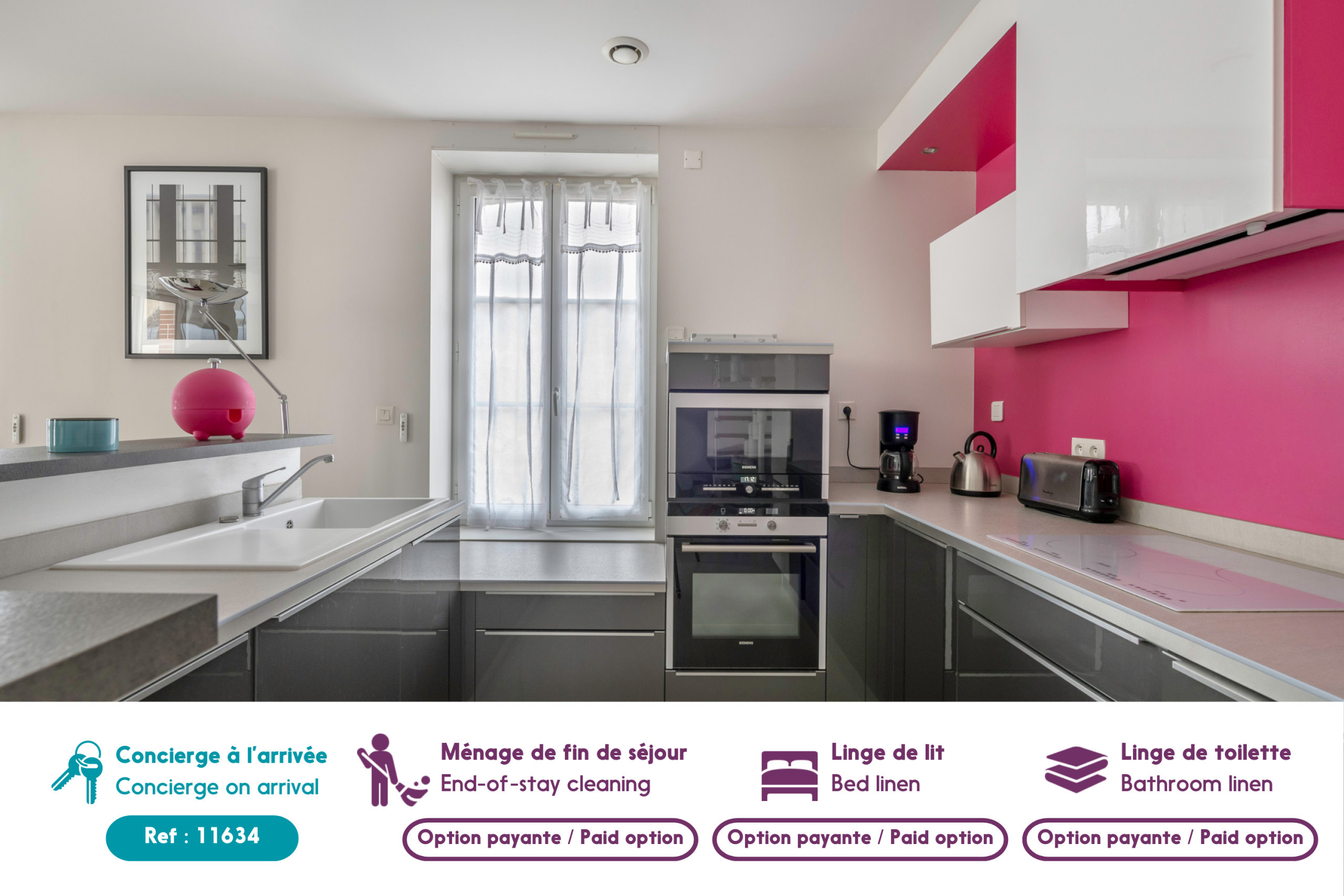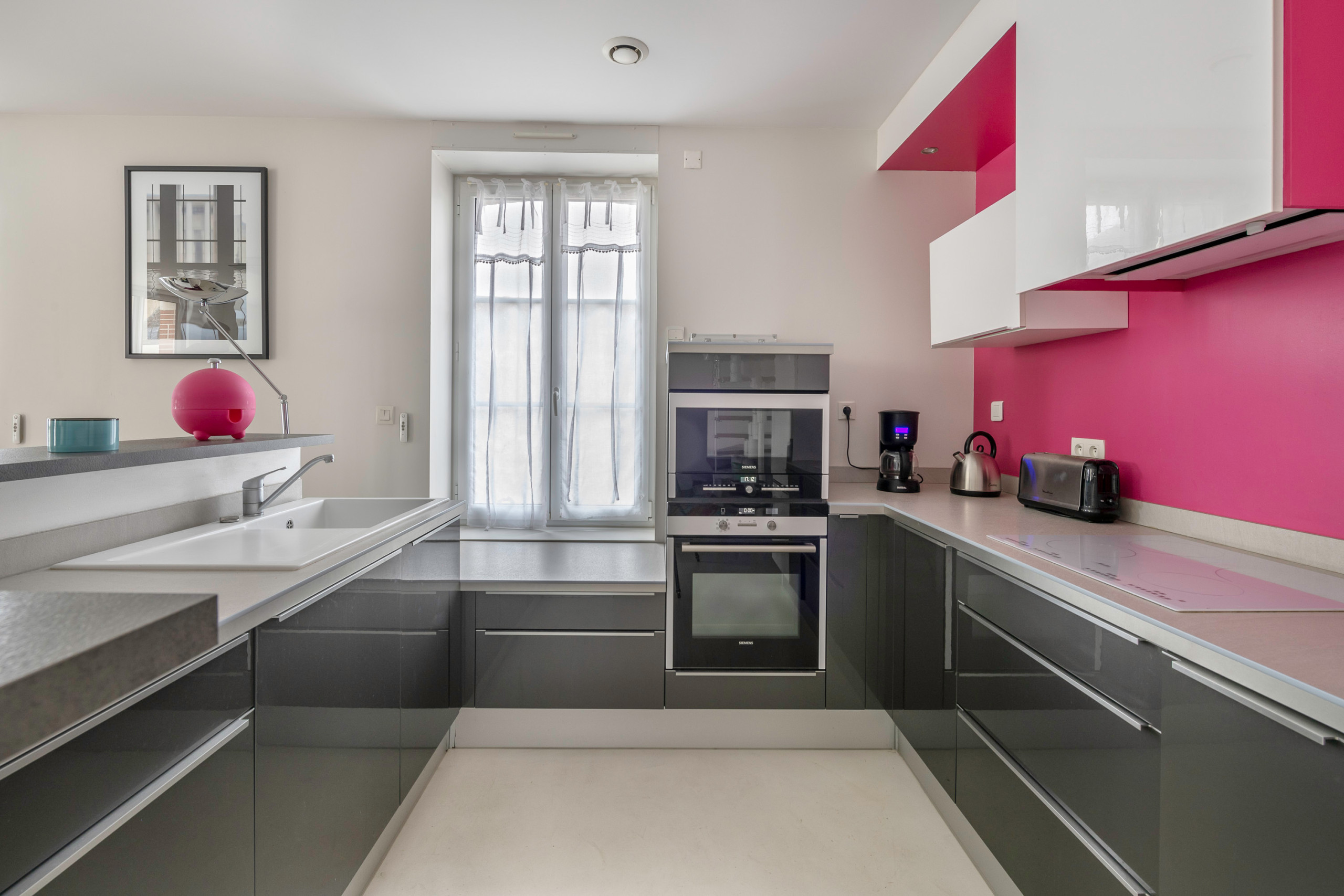 The living area is brightened by colorful touches, the grey kitchen with a pink wall background is modern and very well equipped: induction hobs, refrigerator, microwave, oven, freezer, dishwasher, coffee maker and toaster. The latter is open to the dining room, where you can share convivial moments around good meals. Finally, you will find a cosy living room; its coral sofa brings a touch of cheerfulness. This space is ideal for a TV moment or chatting over a cup of coffee.