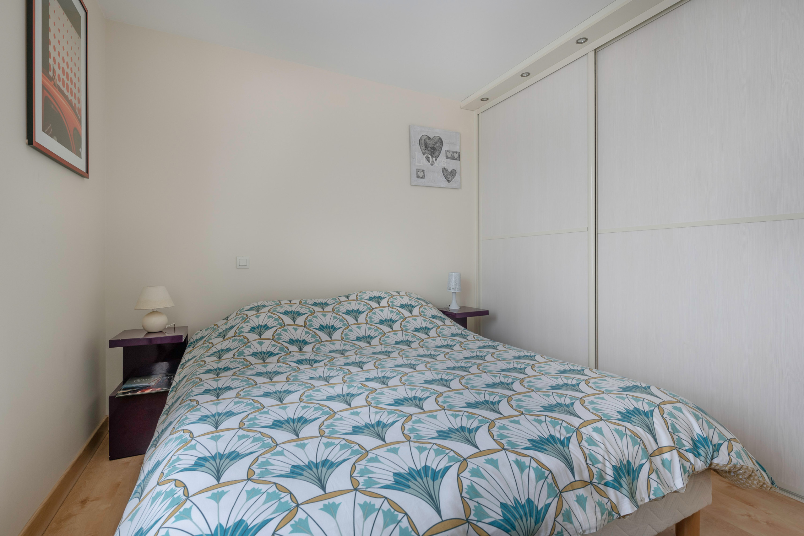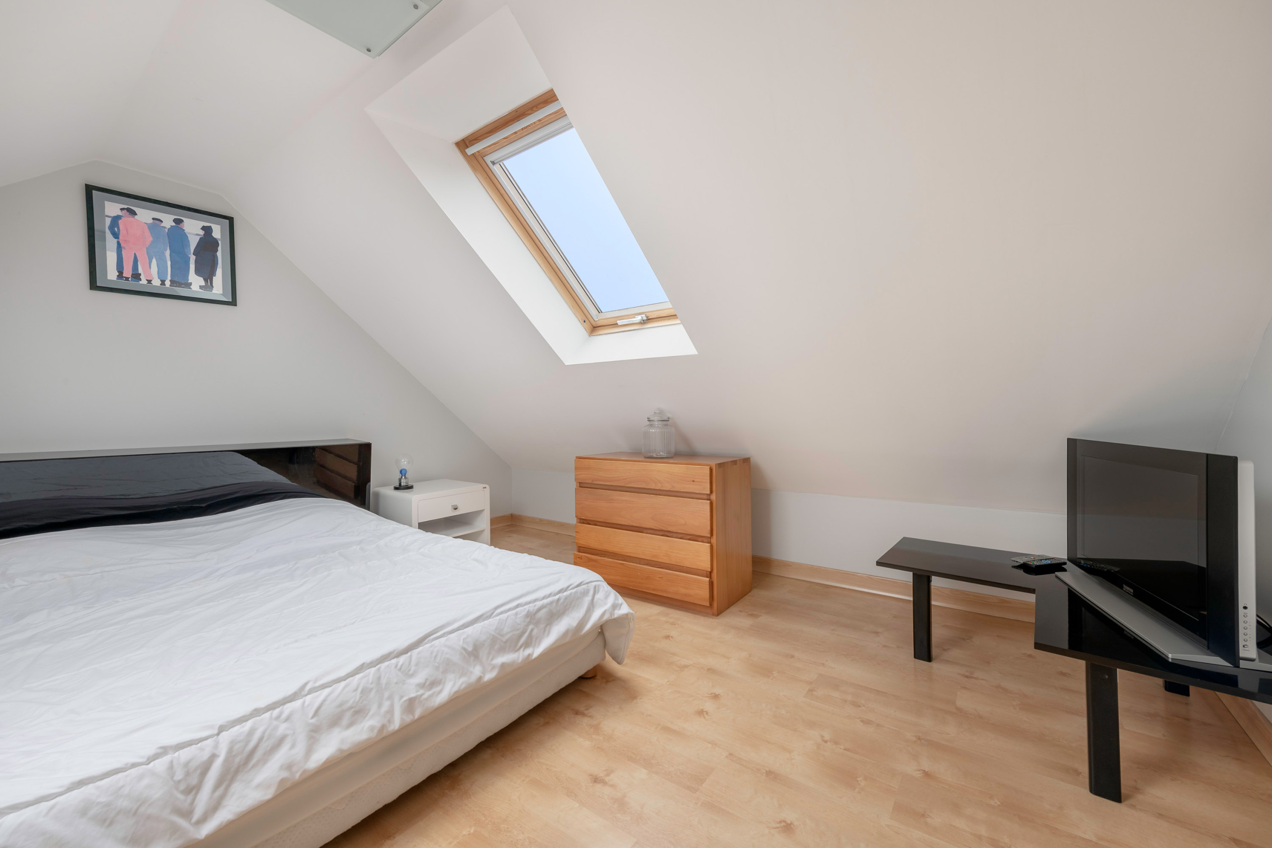 The apartment can accommodate 6 people and has three bedrooms. The first is downstairs and has a queen-size bed to provide the necessary comfort for a good night's sleep. The other two are upstairs. The first has a queen-size bed, a television and two skylights; its two sloping walls make it a soothing cocoon. The second, also in the attic, has a trundle bed for two children and opens onto an adjoining bathroom with WC.