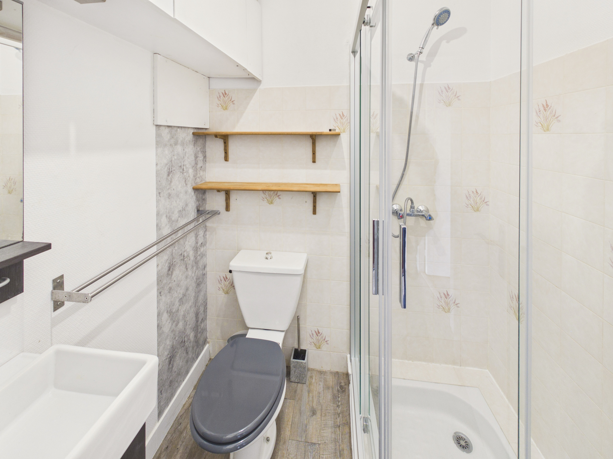 The bathroom is equipped with a shower, a sink and WC.