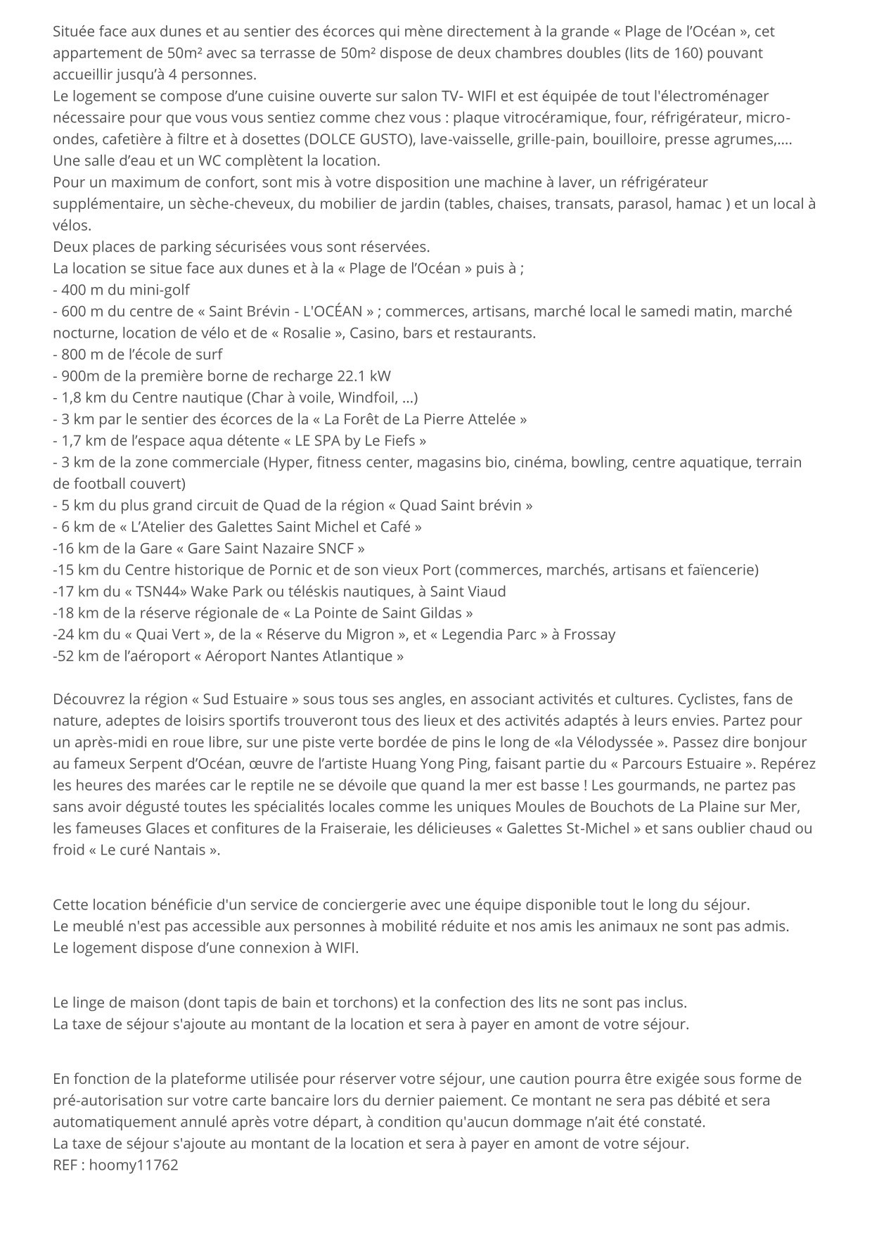 - 600 m from the centre of "Saint Brévin - L'OCÉAN"; shops, craftsmen, local market on Saturday morning, night market, bicycle and "Rosalie" rental, Casino, bars and restaurants.