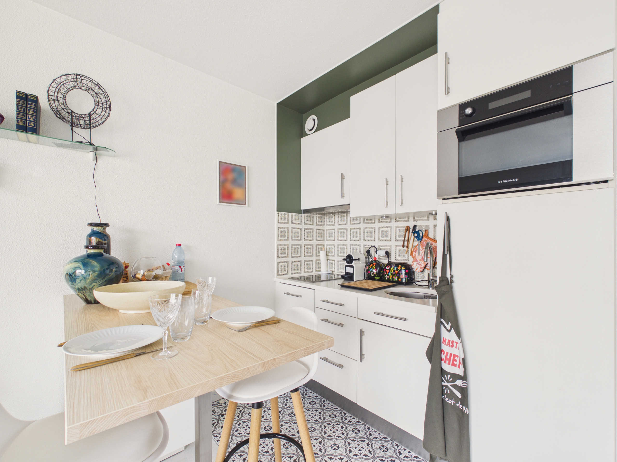 Inside, upon your arrival, you will discover a bright and welcoming living space. The lounge comprises a comfortable sofa, two armchairs and a television, ideal for moments of relaxation. A large bay window brings beautiful light and provides access to the balcony with an exceptional sea view. As an extension, a round table allows you to share meals for two in a warm atmosphere. The open-plan American kitchen, opening onto the living space, is fully equipped: induction hobs, refrigerator, oven, microwave, dishwasher, Nespresso coffee maker, toaster, kettle and everything you need to cook as at home. A second high table with two stools completes this space.