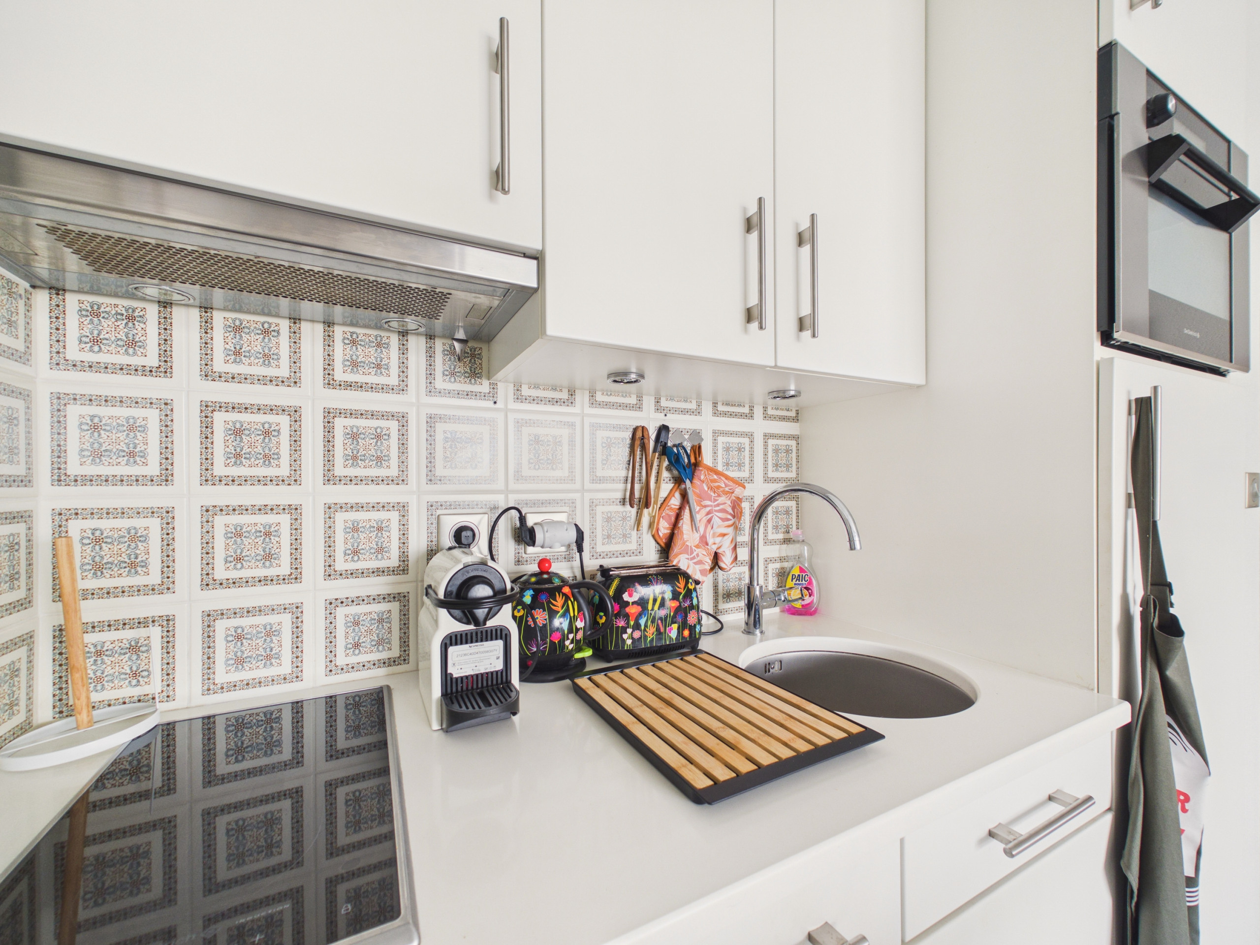 The American-style kitchen is fully equipped with everything needed to prepare delicious meals: induction hobs, refrigerator, freezer, oven, microwave, filter coffee maker and Nespresso, kettle, toaster, and all necessary utensils.