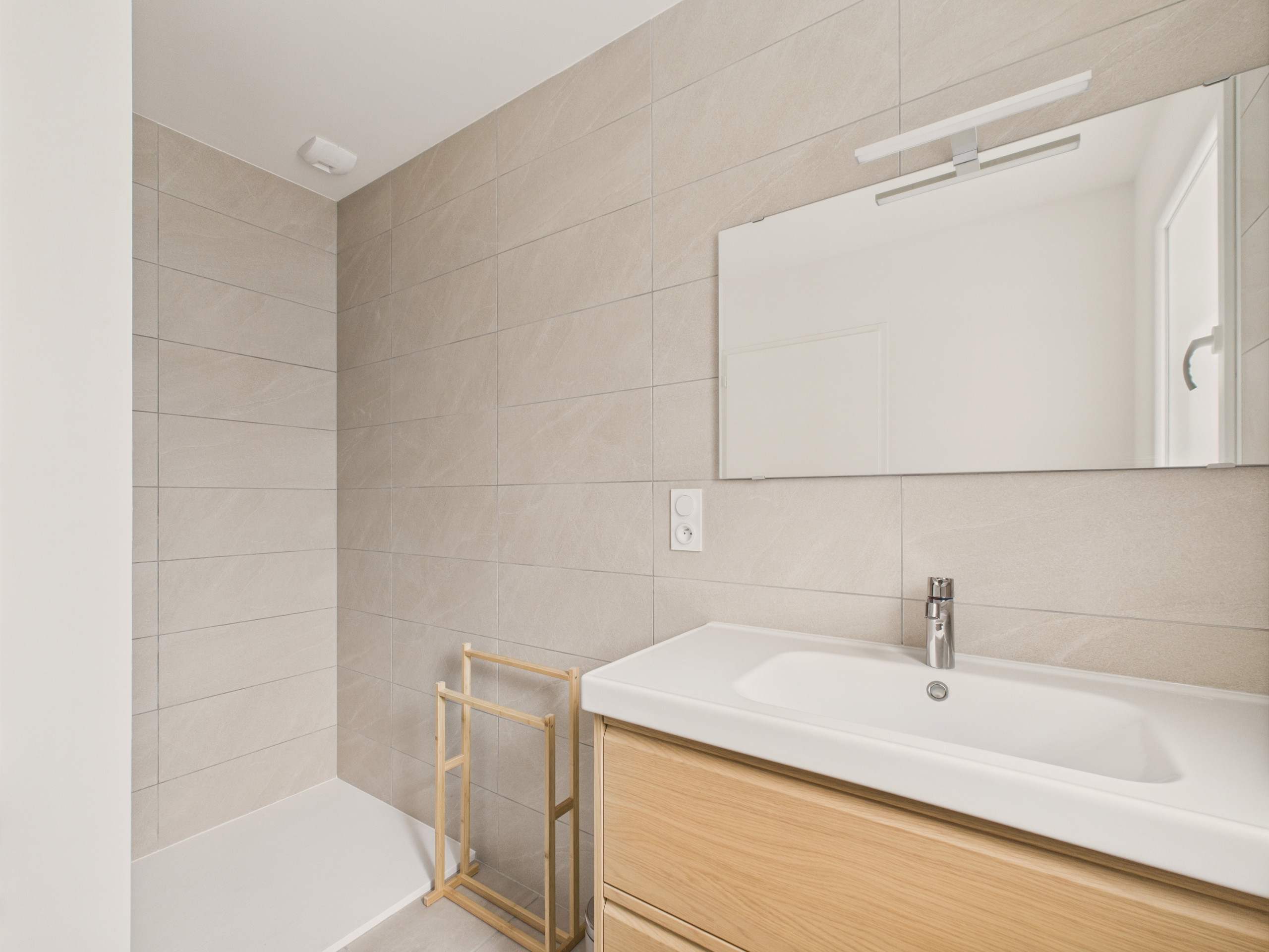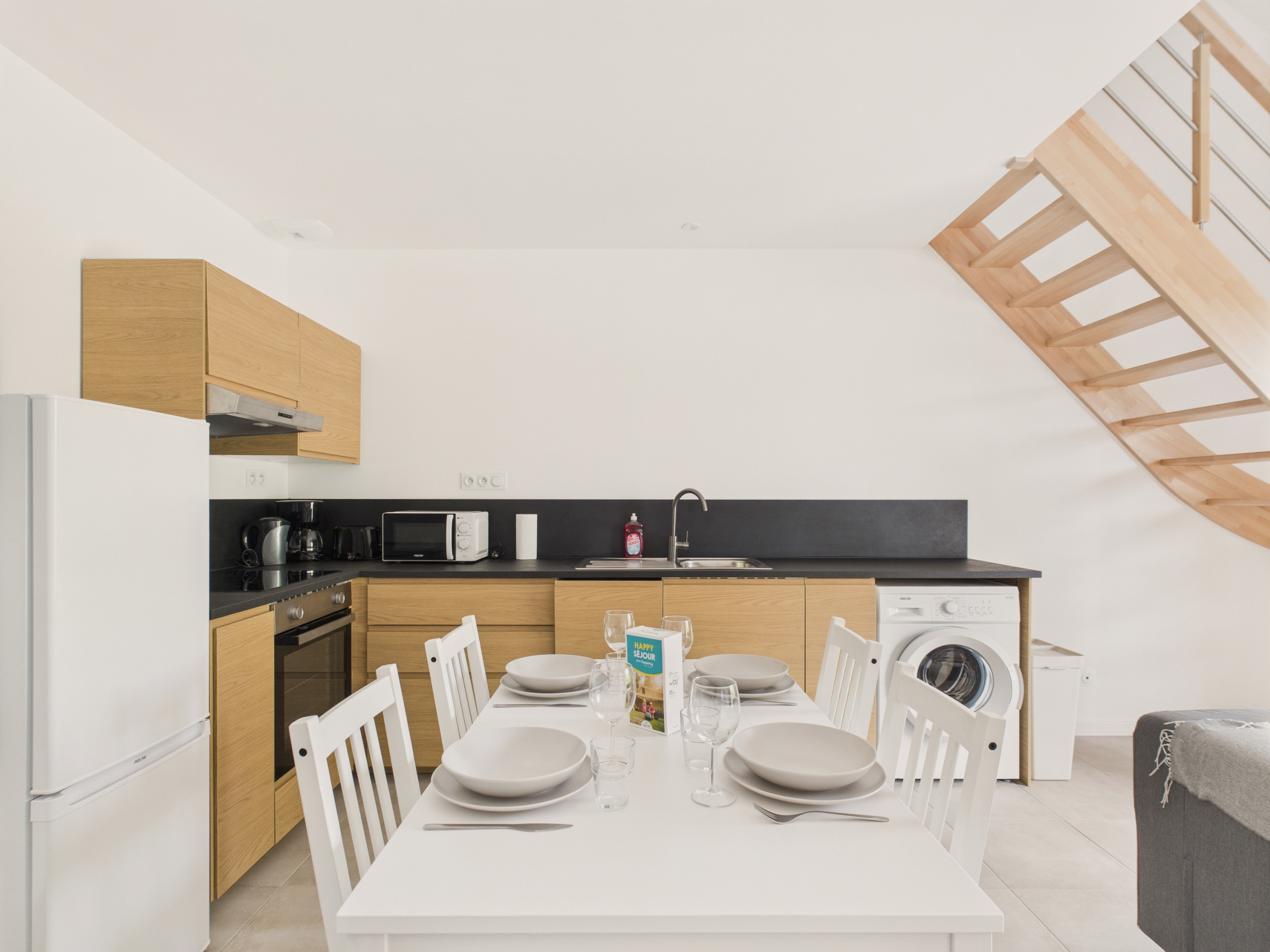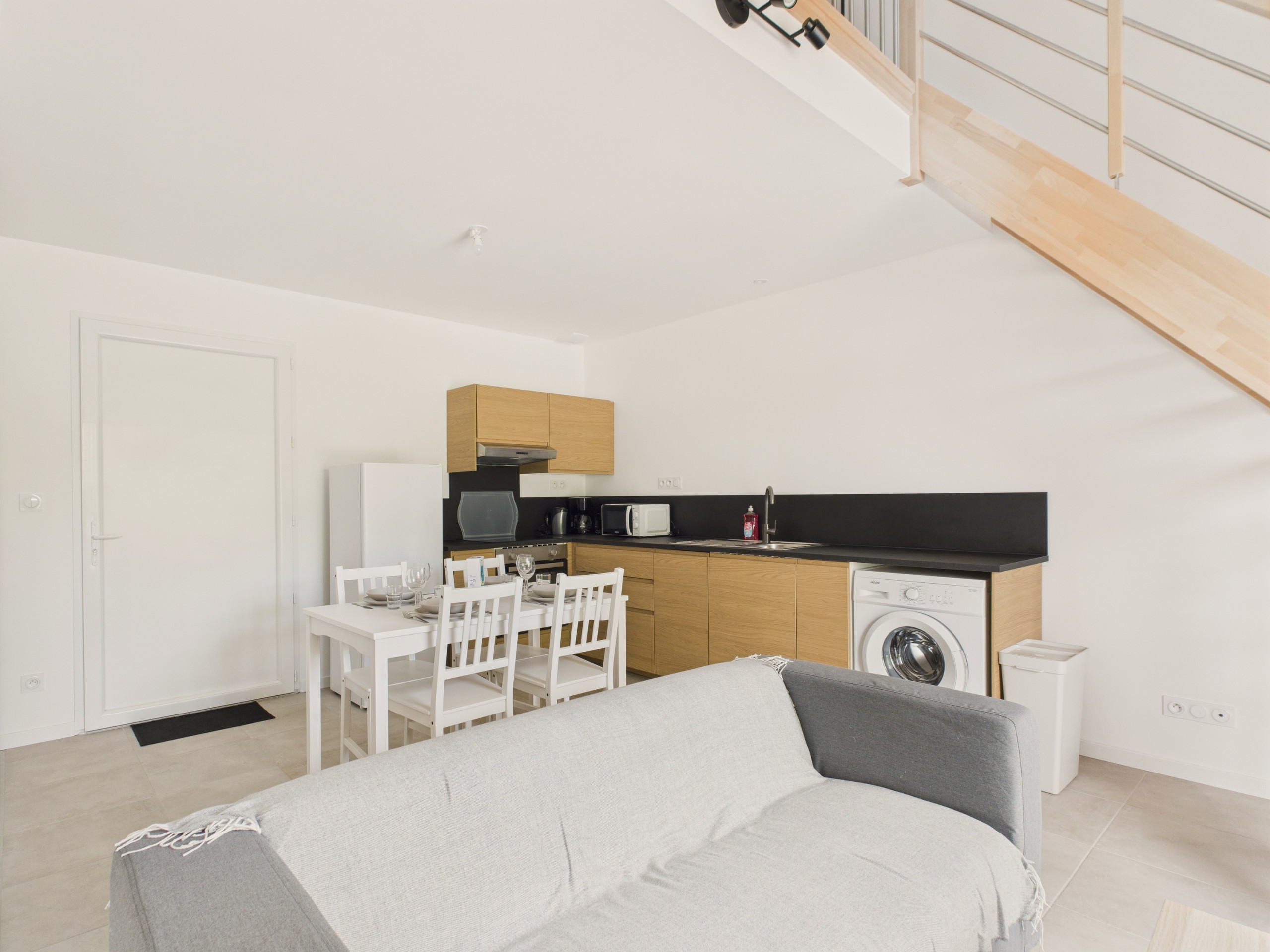 You will find a well-equipped kitchen (induction hobs, refrigerator, microwave, freezer, dishwasher, coffee maker, toaster, kettle and citrus press) to prepare good meals. It is open to a round table where you will enjoy gathering to savour these delicious dishes and spend moments of laughter. Then, the living room will allow you a break in front of the television. When evening comes, you can unfold the sofa to snuggle up for the night. Finally, you will find a room with a double bed in light tones and a bathroom to treat yourself to a good shower after your return from the beach.