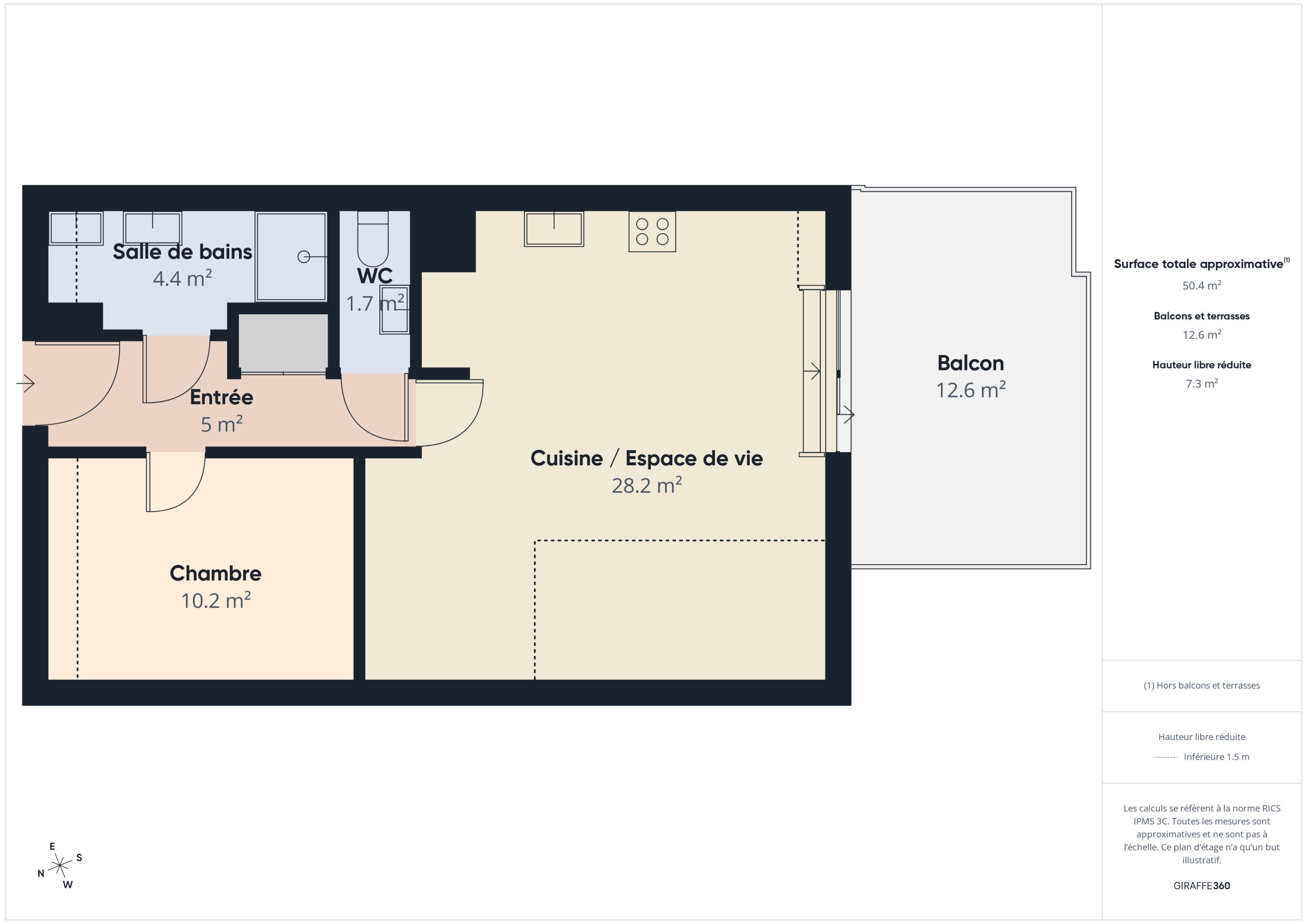 Inside, discover a large living area of over 30 m² offering direct access to the balcony. The open kitchen, fully equipped (refrigerator, freezer, oven, microwave, induction hob, dishwasher), allows you to prepare your meals as if at home. For breakfast, a kettle, a toaster, a filter coffee maker and a Nespresso machine are also available. Share your meals around the indoor dining table or enjoy the one on the balcony on beautiful days. In the evening, relax in the lounge area, comfortably seated on the sofa facing the television.