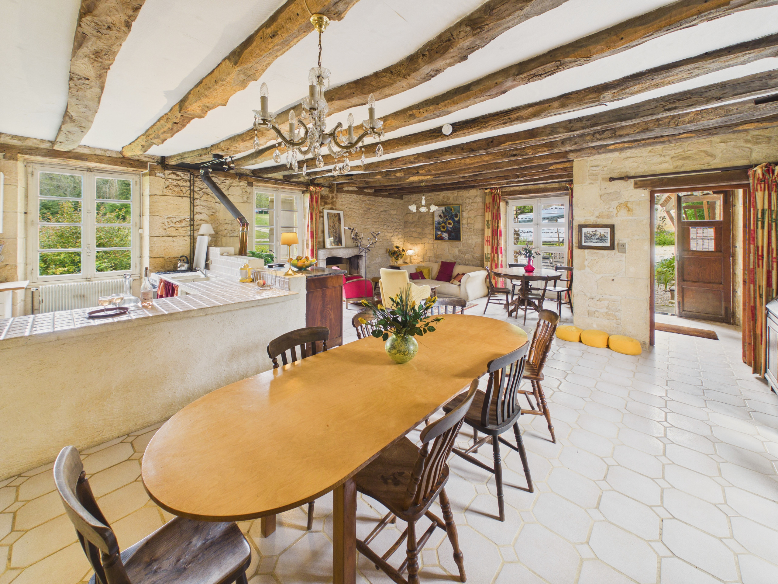 The house comprises a beautiful living space including a lounge with comfortable sofas and an armchair. The wood-burning stove will be very pleasant during cooler evenings. The dining area, with its large table, will allow you to share convivial meals whilst admiring the view over the garden. The kitchen is equipped and has everything you need to prepare delicious meals: gas cooker, electric oven, microwave, toaster, kettle, filter coffee maker and all the utensils you might need.