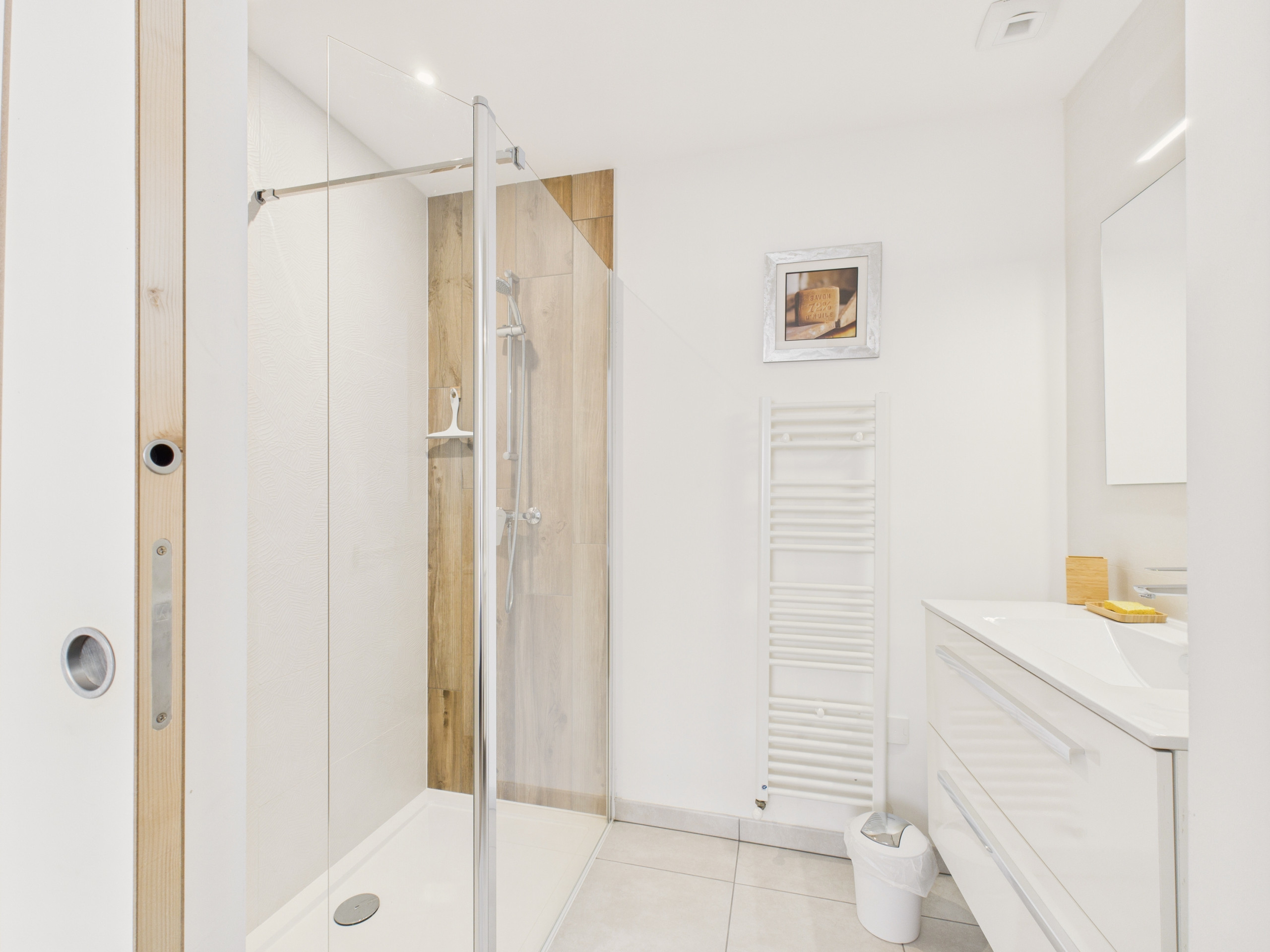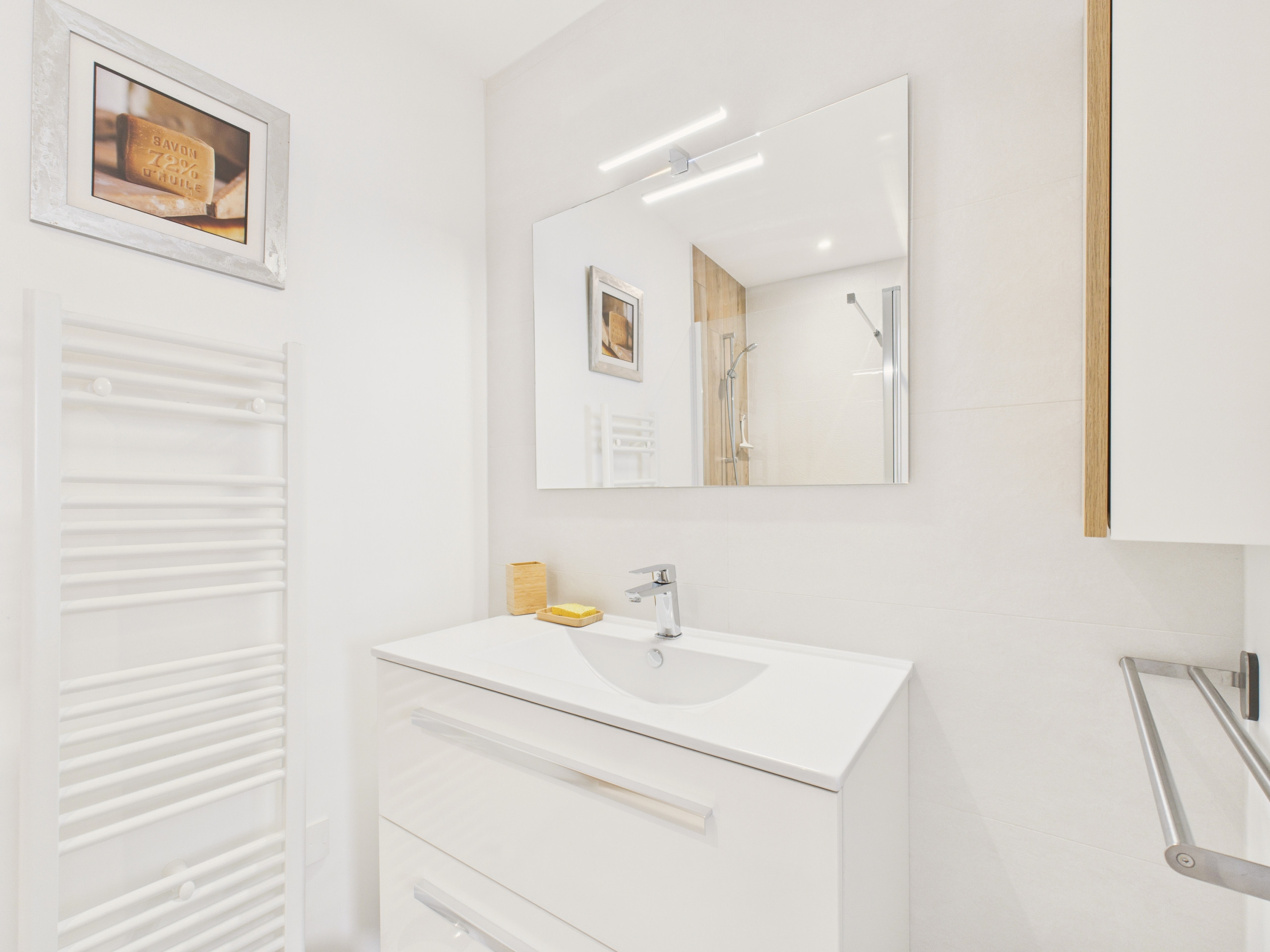 The kitchen, modern and bright, provides you with everything necessary: induction hobs, refrigerator, microwave, oven, freezer, dishwasher, Nespresso coffee maker, filter coffee maker, toaster and kettle.