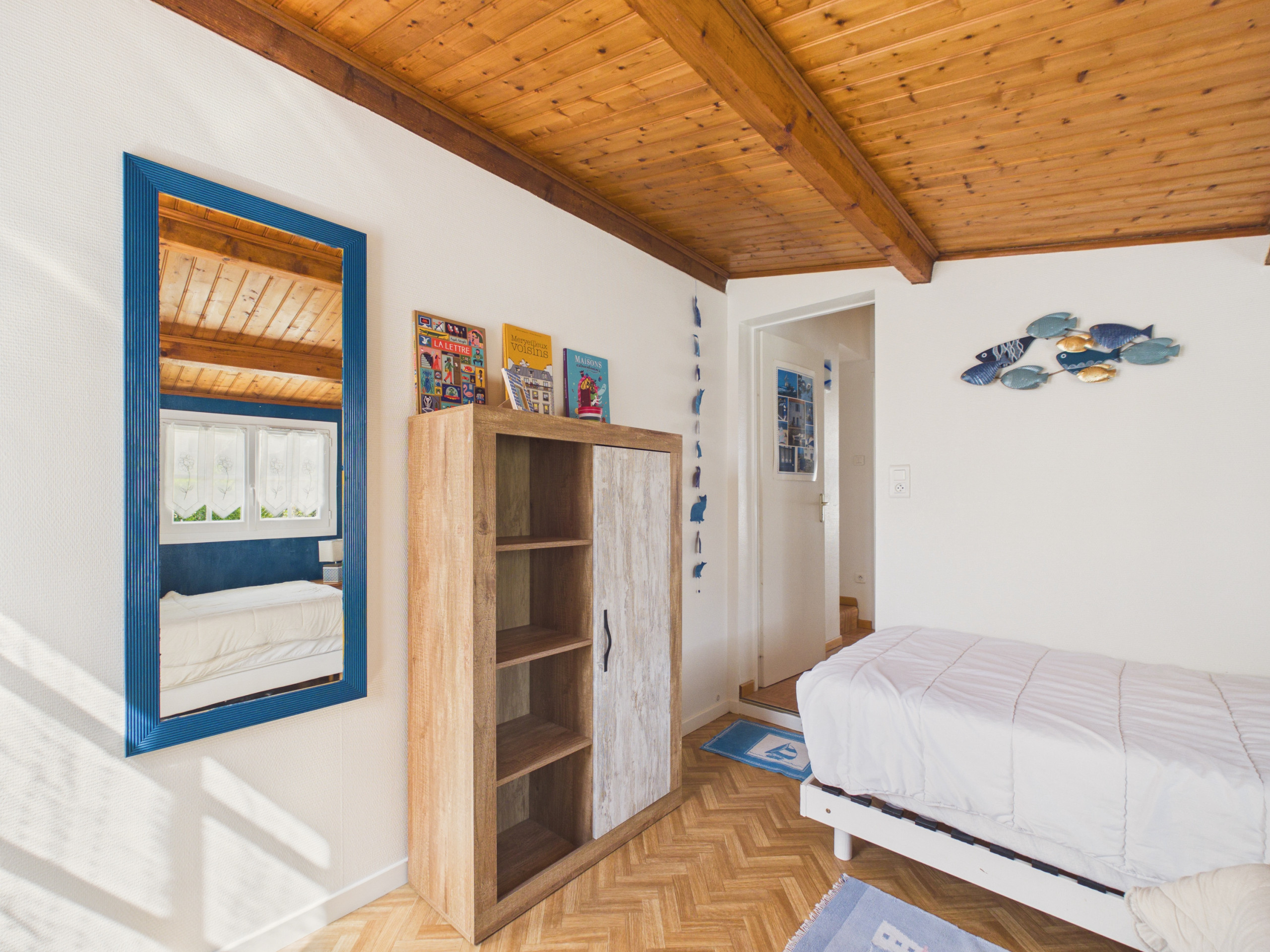 The house can accommodate 8 people (4 adults and 4 children) thanks to its three bedrooms. The first, yellow with a colourful floor, has a double bed. The second, where wood reigns, is also equipped with a double bed. Finally, the last one will delight the children with its two bunk beds, allowing them to relive their day at bedtime and create beautiful holiday memories.