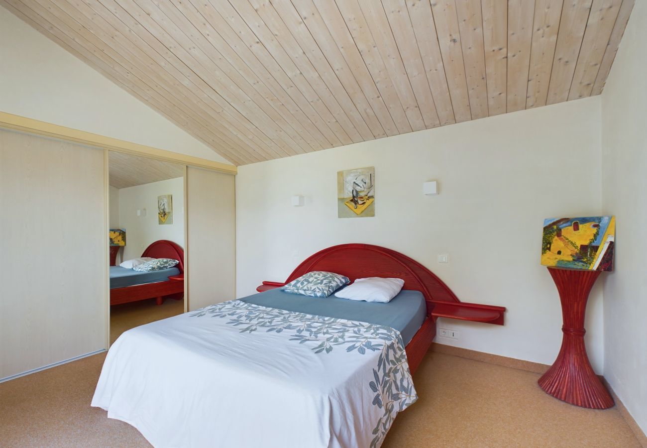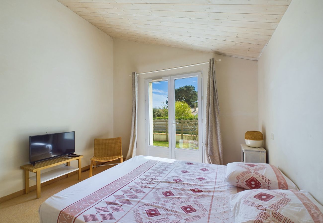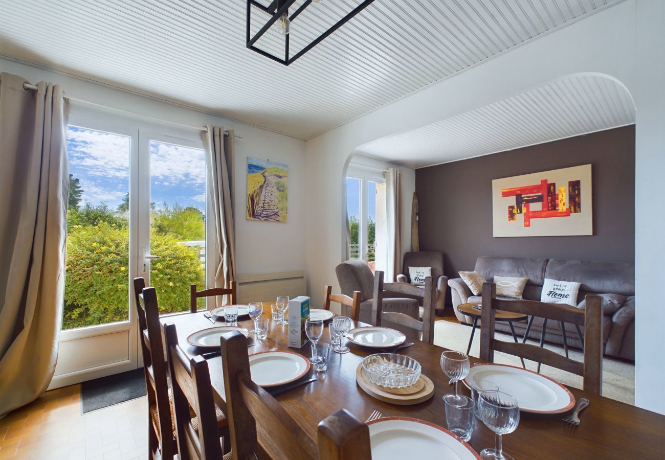 The white walls, tile roofs, and brick facings stand out nicely against the green surroundings of the large garden. The 132 m2 long house has 4 bedrooms with beds for 2 people and one bedroom with 3 beds. They are all welcoming with their headboards and their cozy touch. The master suite has its own bathroom. In total, 3 bathrooms (2 with showers, 1 with bath) and 3 toilets are distributed in the house, open to vacation rentals for 9 people. The independent kitchen (induction) is fully equipped and has large worktops. It adjoins the dining room which extends into a large living room with TV, radio and fireplace. The simple decor is punctuated by refined and family touches. Living room and living rooms make the most of the sun that enters through the patio doors. They lead directly onto the tiled terrace. Garden furniture and barbecue allow you to sit in the wooded and fenced garden.