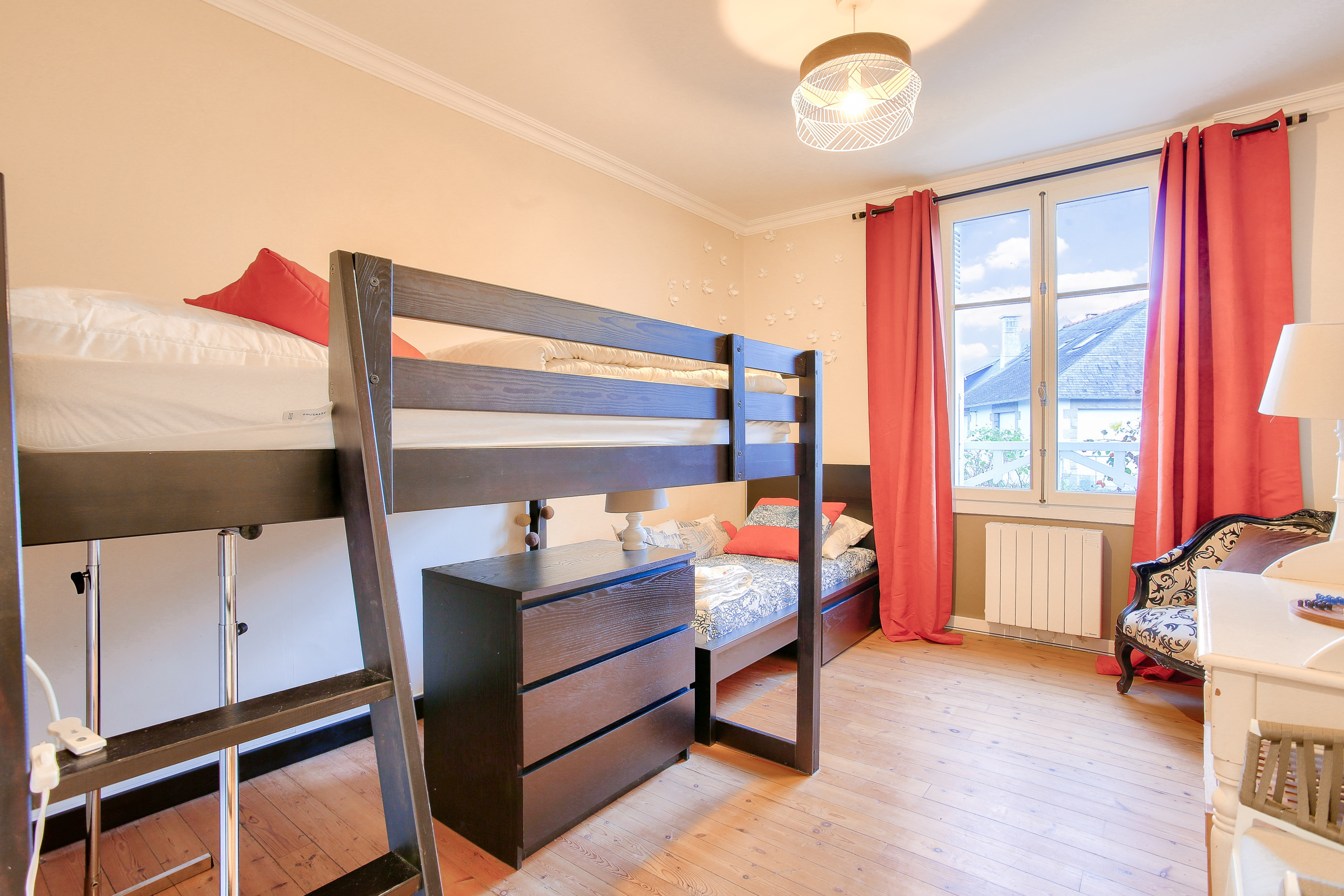 The following staircase, in the entrance, leads you to a comfortable TV lounge with soft and restful tones. Just next to it, the children's bedroom consists of a mezzanine bed with a double bed (140 x 190 cm) and a single bed. A bathroom with a bathtub and an independent toilet complete this level.