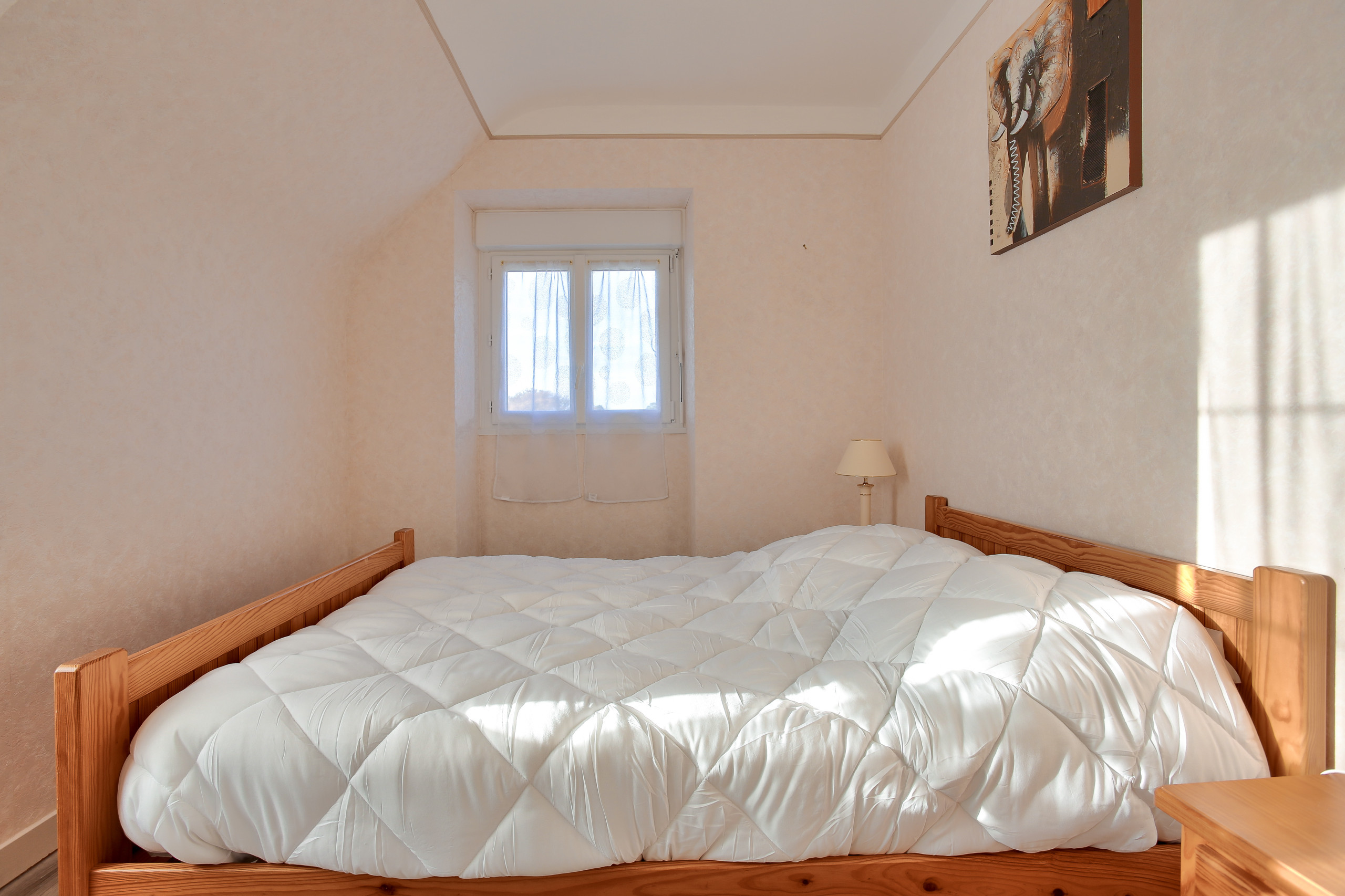 Upstairs, you will discover two bedrooms, both with a water point and beautiful parquet flooring that gives them all their charm. The first is fitted with a double bed while the second has two single beds. You will find two additional sleeping spaces in the living room by unfolding the sofa.