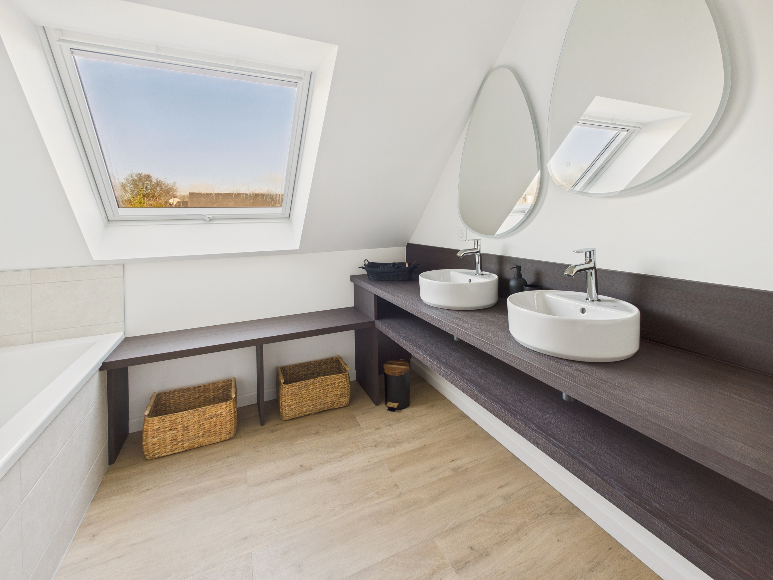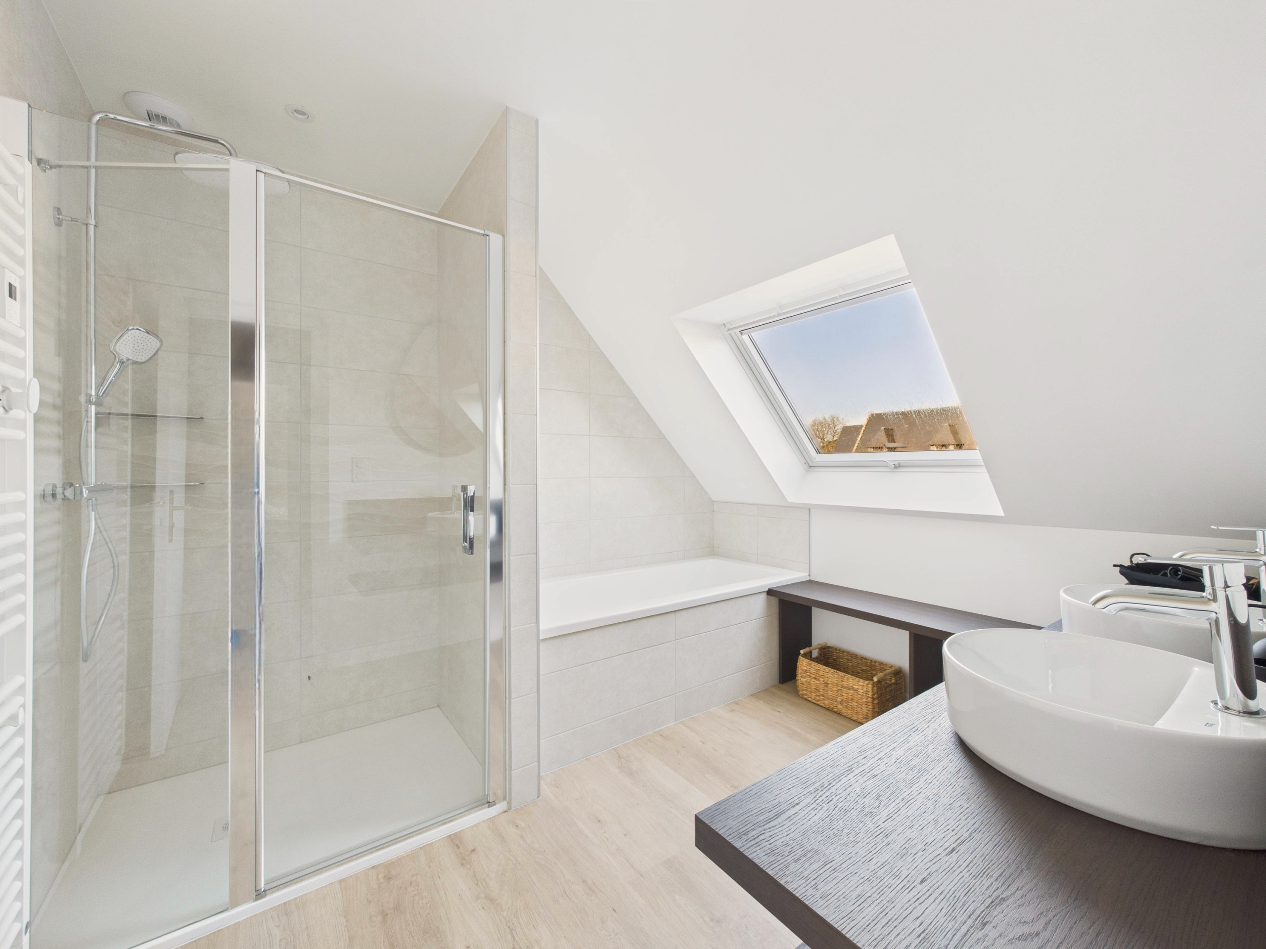 The house has two bathrooms, one on the ground floor with a shower, the second upstairs with a shower and bathtub, both equipped with a hairdryer. The two toilets are separate for greater comfort.