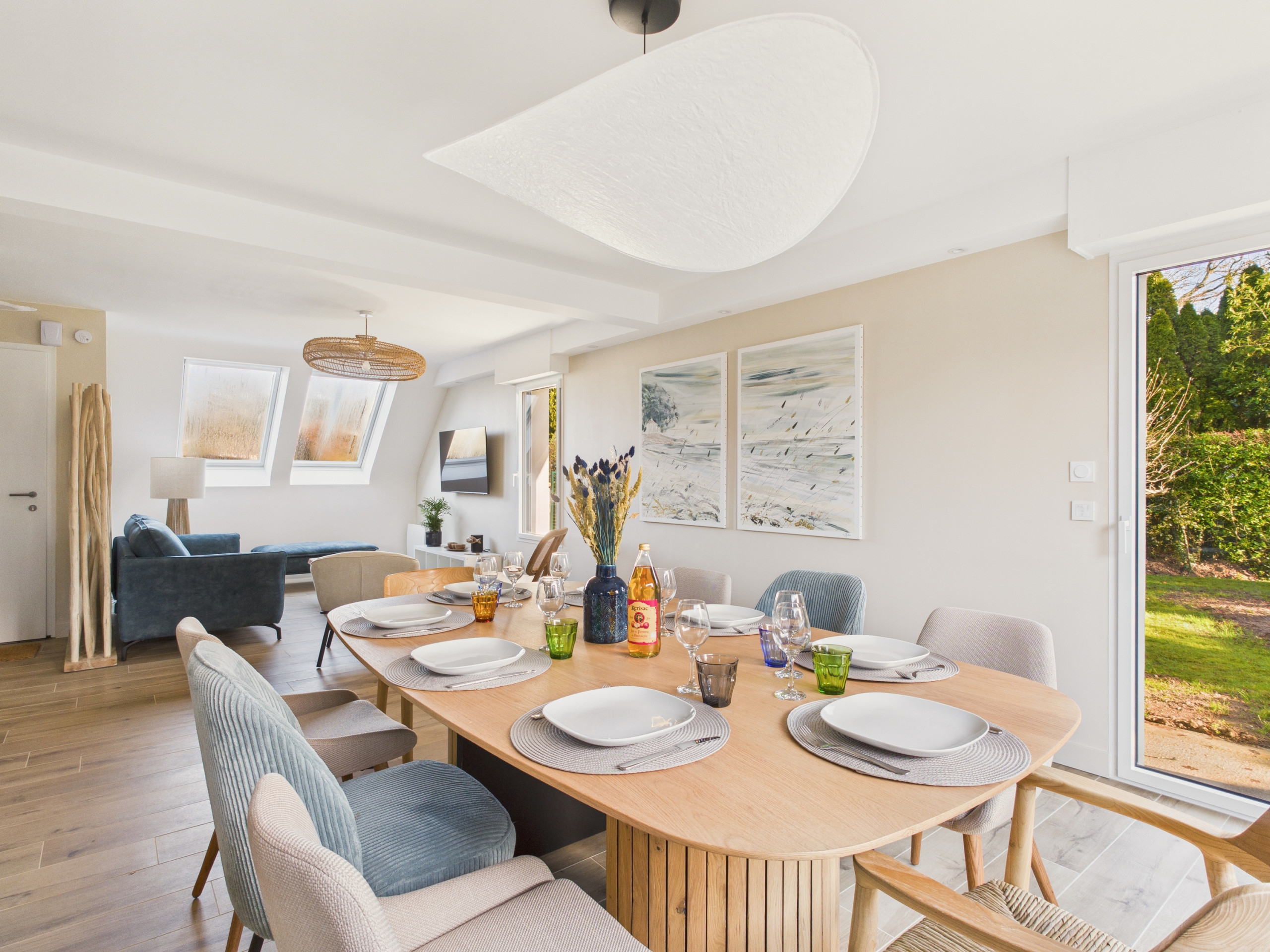 Inside, discover a bright and beautifully decorated living room with direct access to the terrace and garden. The open and modern kitchen is fully equipped (refrigerator, freezer, microwave, oven, induction hobs, dishwasher and raclette appliance) and has everything you need to prepare your meals, as well as a kettle, toaster, a filter coffee maker and a Senseo machine for breakfast. Share your meals around the table for 8 people or enjoy the terrace on beautiful days. In the evening, gather in the lounge area, comfortably seated on the sofa in front of the television.