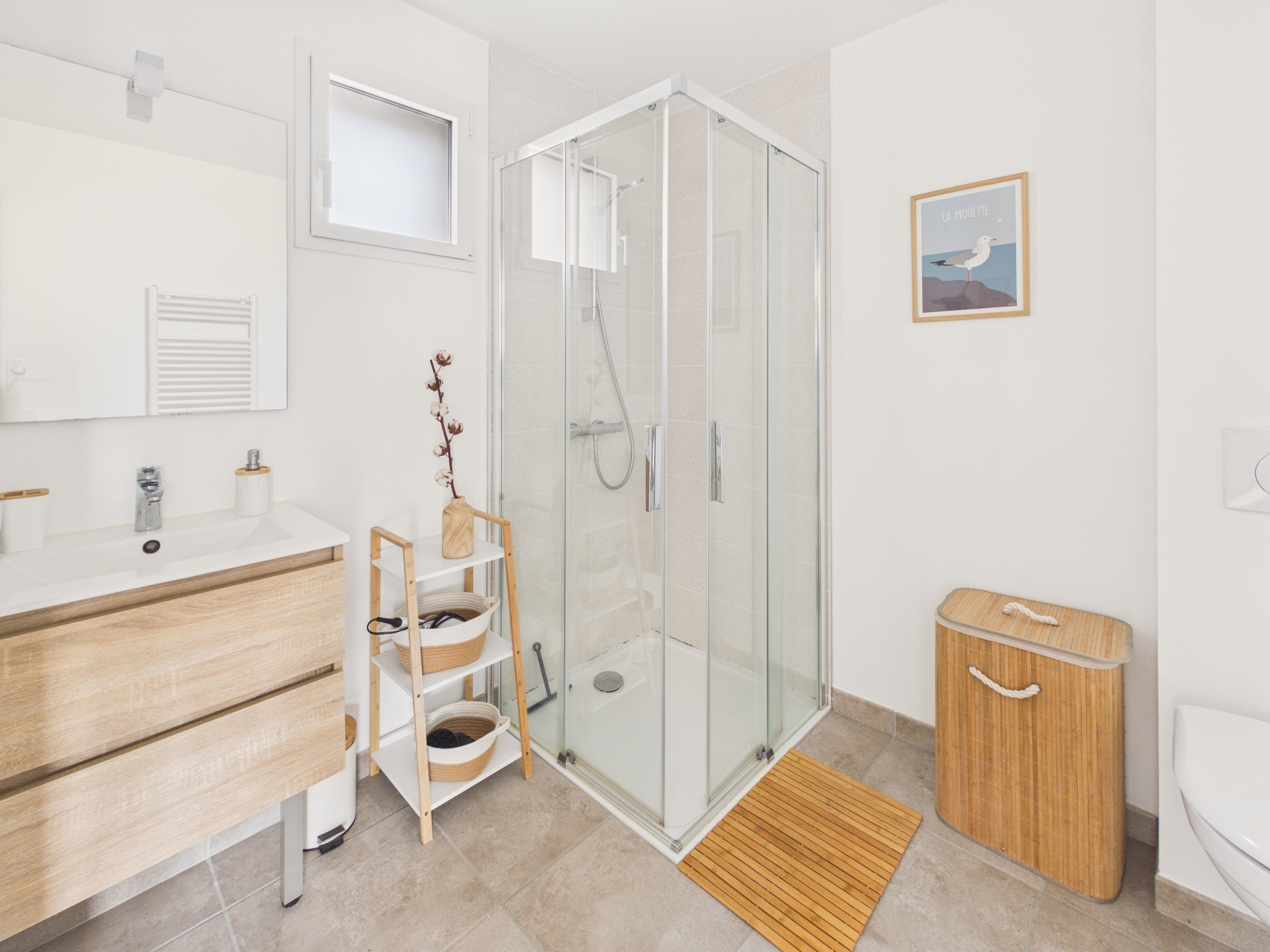 Enter through the entrance door and discover a bright living room with access to the terrace. The kitchen, open and modern (refrigerator, freezer, induction hobs, oven, microwave, dishwasher) will allow you to prepare your meals as if at home. For breakfast, you will also have a kettle, a toaster and two coffee makers (one filter and one Dolce Gusto). You can share your meals around the indoor dining table or enjoy the terrace table on beautiful days. In the evening, gather in the living area, comfortably seated on the sofa facing the television.