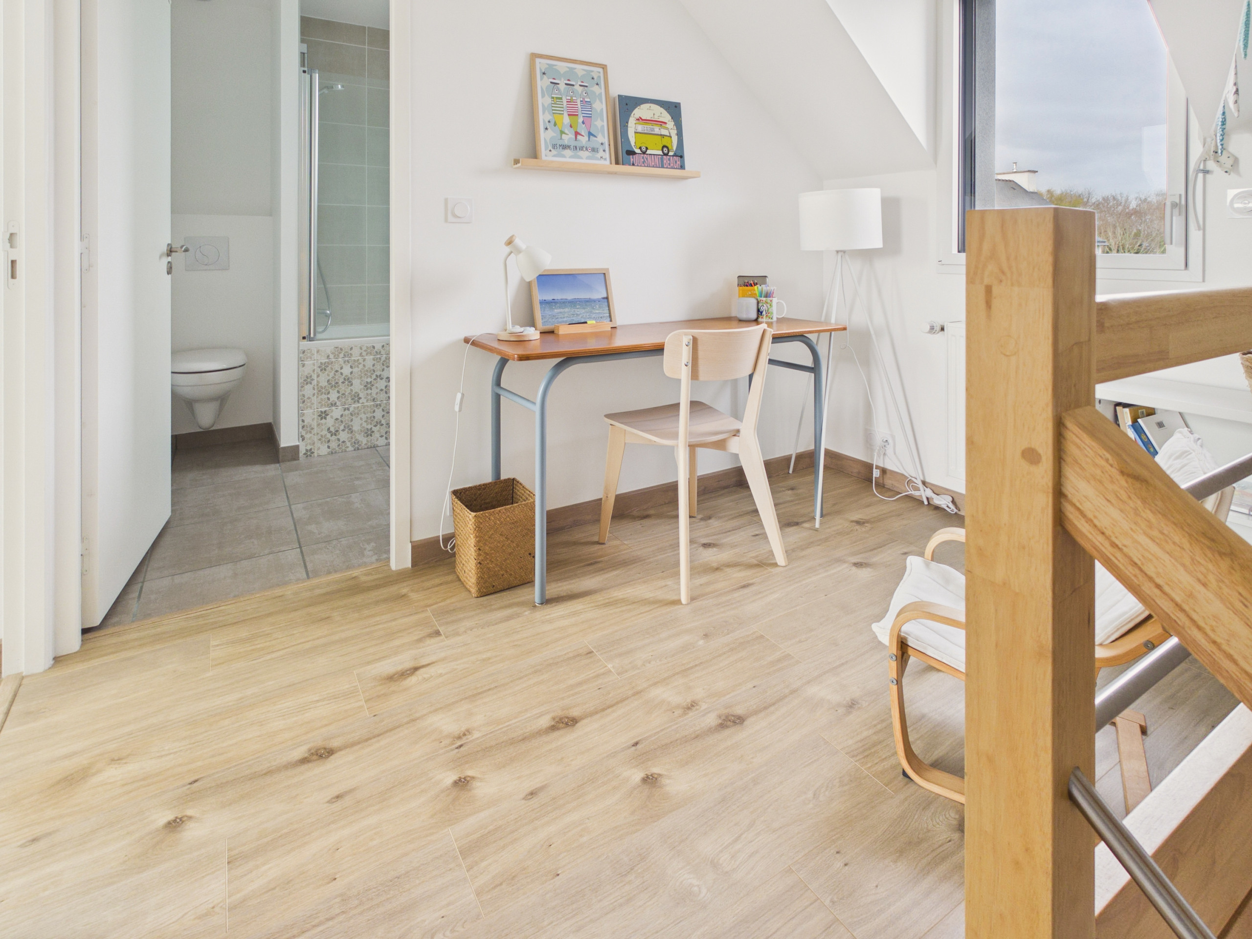 At the top of the stairs is a desk and a bookshelf filled with children's books.