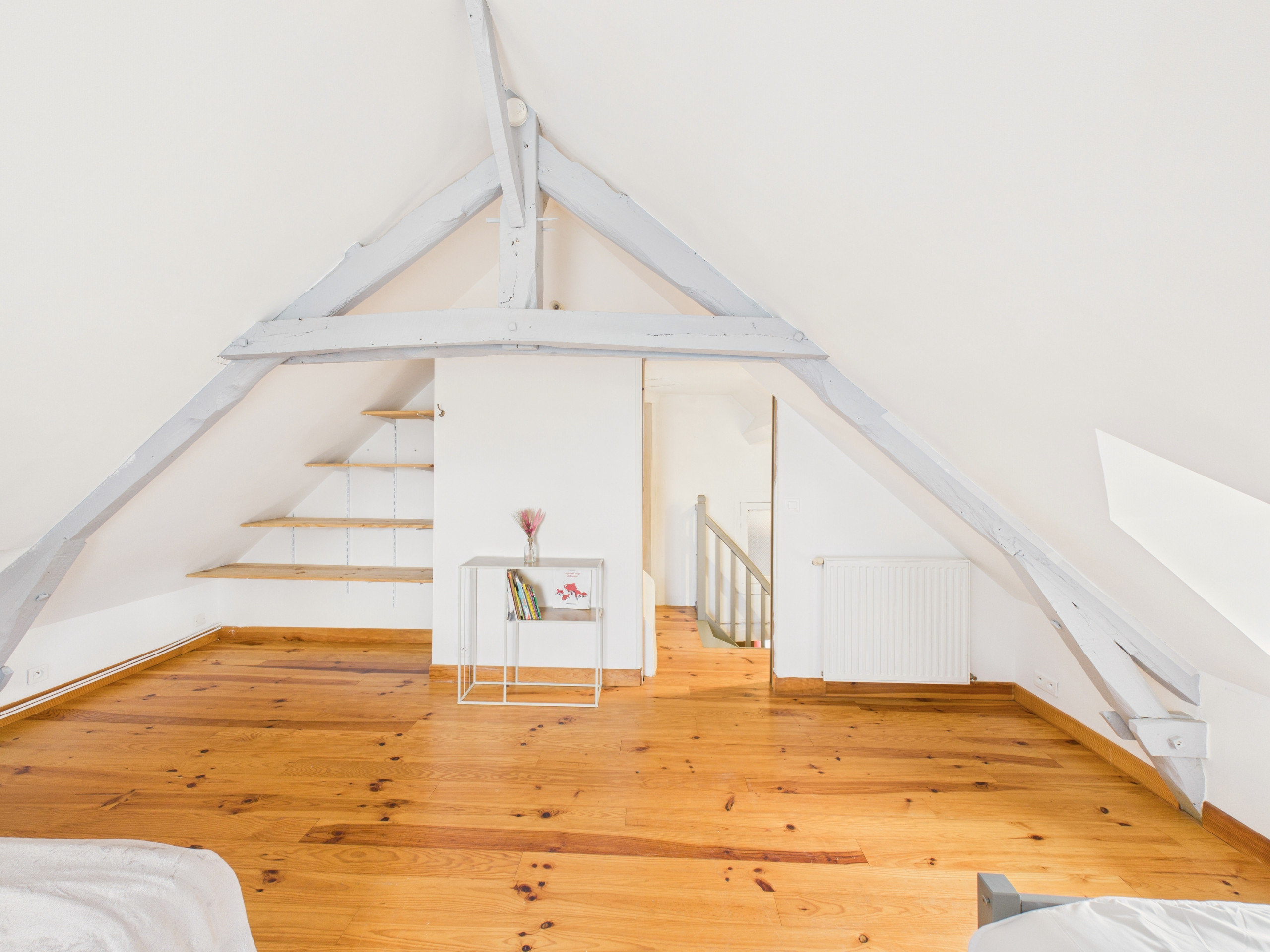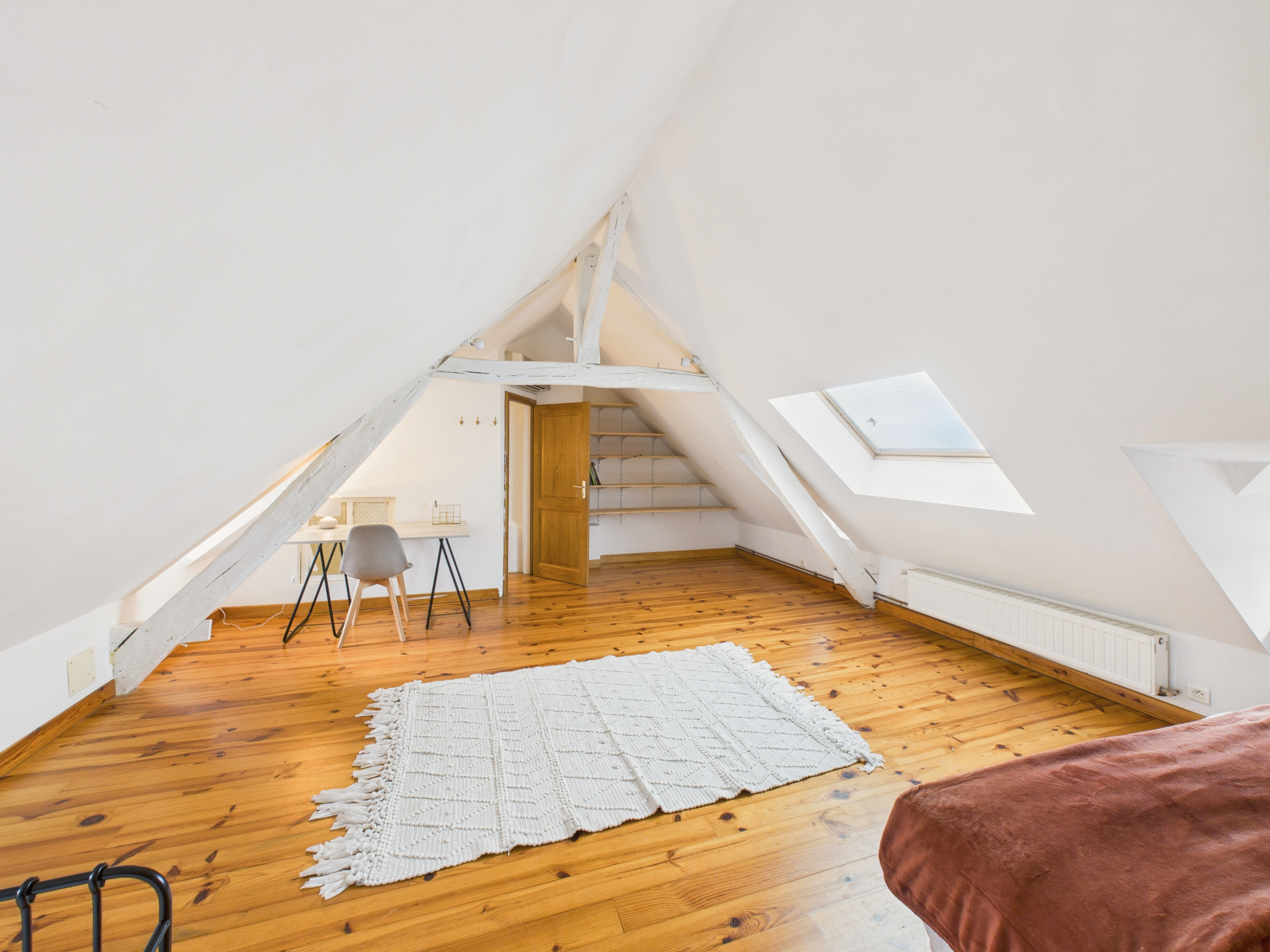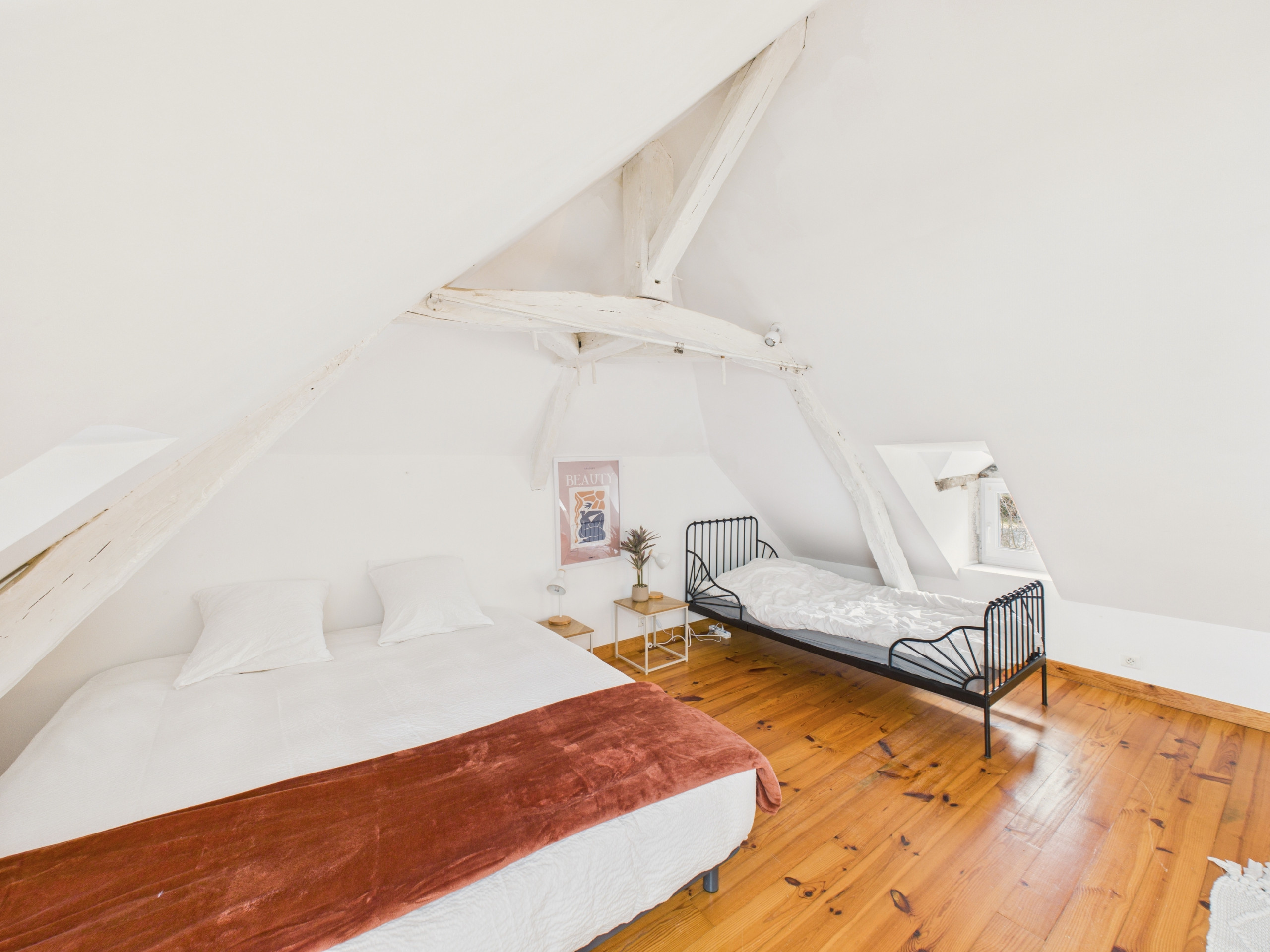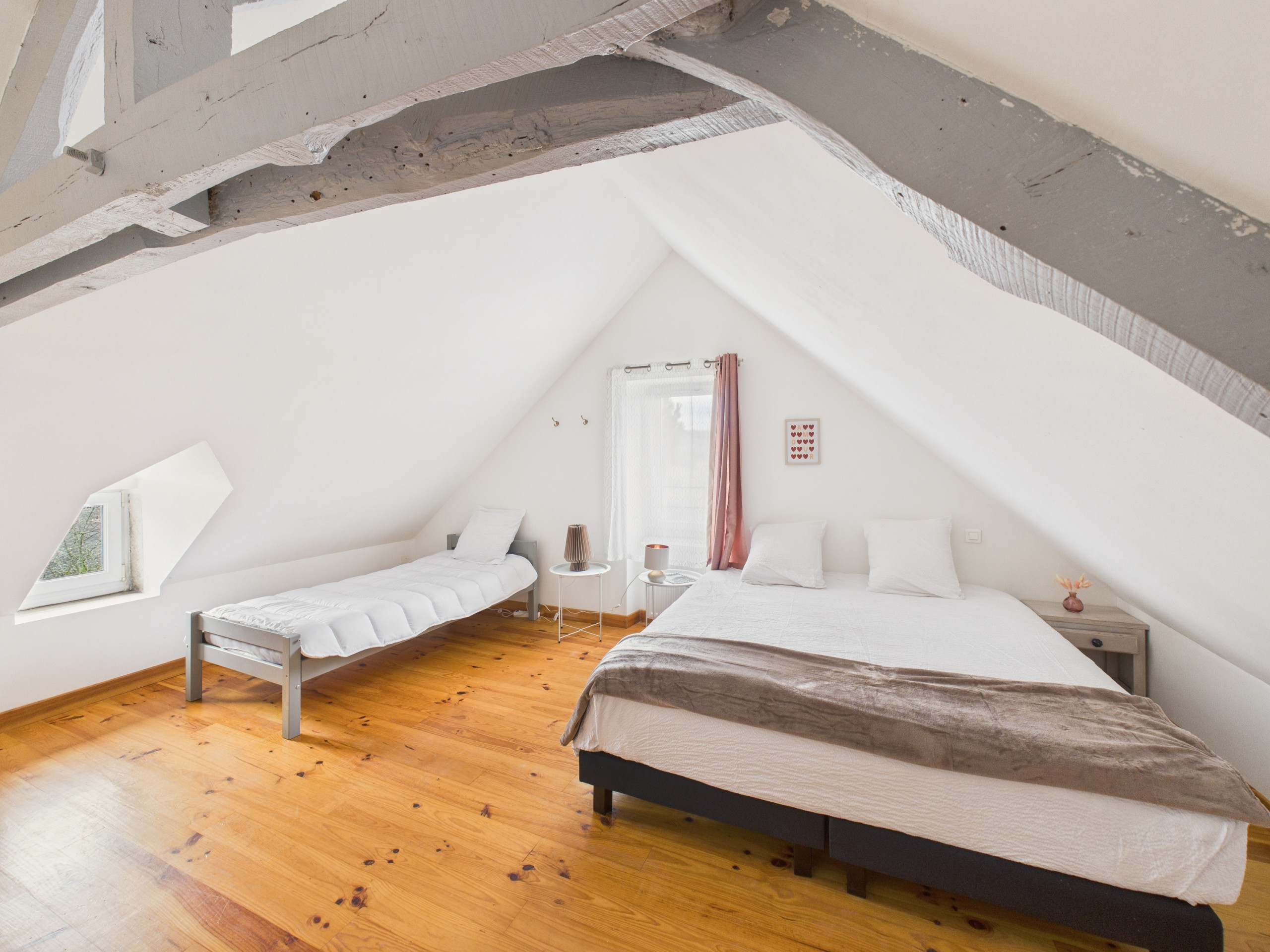 Bedroom 2 – upstairs: a large 34 m² bedroom with a king-size bed (180x190 cm), a single bed (90x190 cm) and a desk.