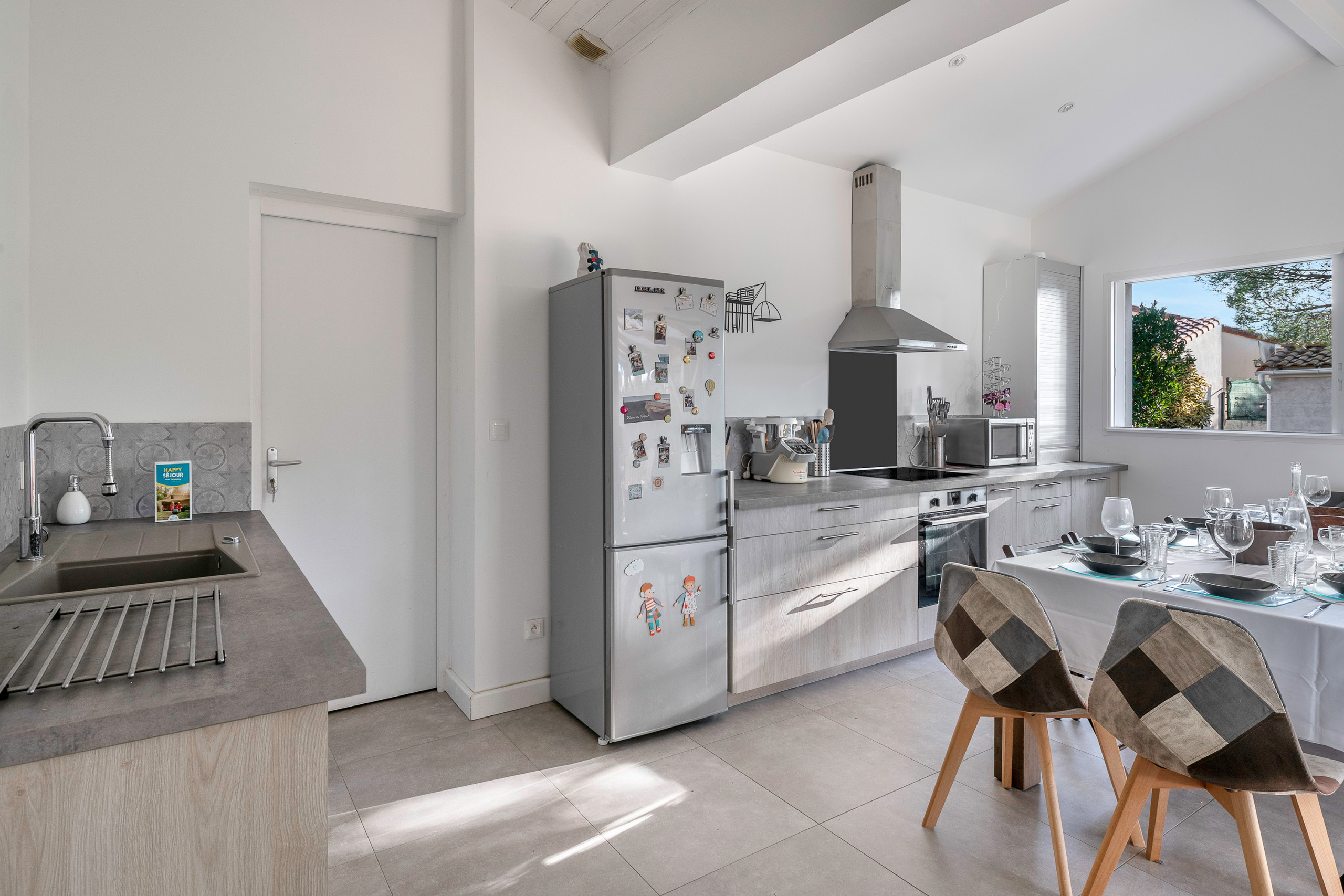 The main house consists of a comfortable living room with a TV lounge area and its DVD/Blu-ray player and a dining area (note that the TV does not offer channels or platforms but can accommodate a Chromecast or any equivalent system). Right next to it, you will find the open kitchen, equipped with all the necessary household appliances to make you feel at home: vitroceramic hob, oven, microwave, filter coffee maker and Dolce Gusto, toaster, kettle and multi-function food processor. On the night side, the house includes a master suite (140 bed) with bathtub, two double rooms (140 bed), a single room for a child (90 bed), a bathroom and an independent toilet.