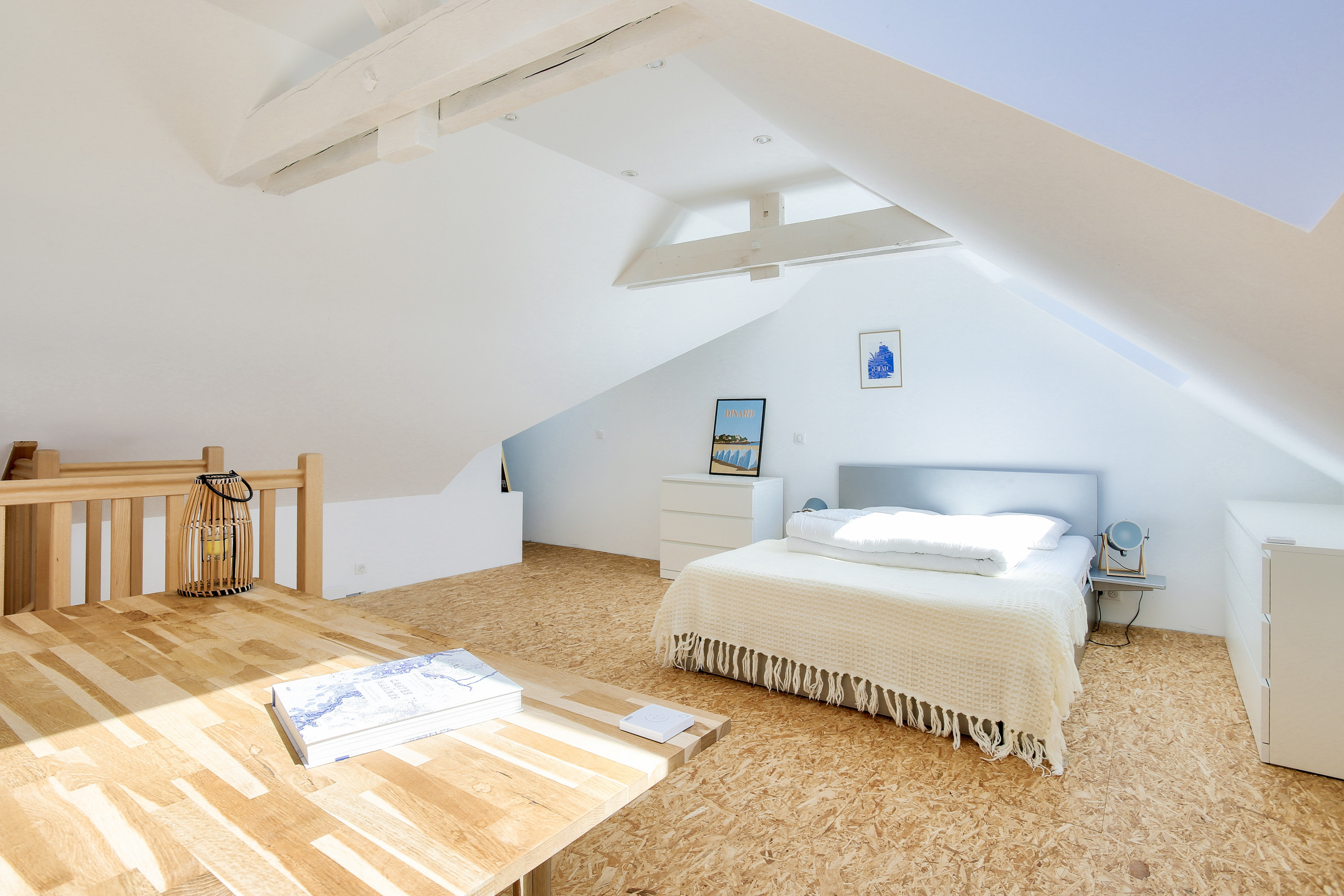 On the night side, the house is spread over two floors. On the first floor, you will find two comfortable bedrooms: the first with two single beds (80x200), ideal for children or friends, and the second with a queen size bed (160x200). The second floor houses a spacious bedroom with a Queen Size bed (160x200), nestled under the roofs for a cozy atmosphere.