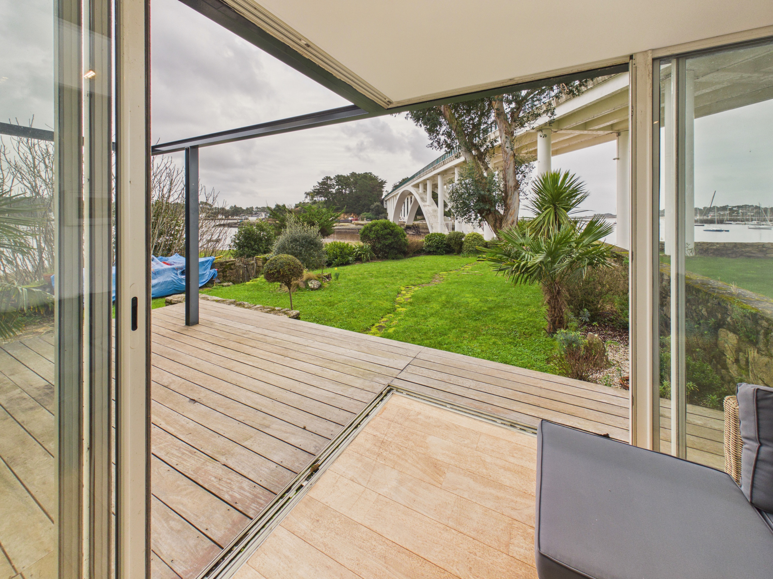 Outside, you will enjoy a perfectly maintained enclosed garden, ideal for family moments. The 25 m² terrace, fitted with garden furniture, a barbecue and a plancha, will be the perfect place for your sunny lunches and summer evenings facing the sea. The house also has a bright veranda, a true relaxation space with a sofa, offering an exceptional view of the garden and the ocean, a unique setting to enjoy the panorama in all seasons.